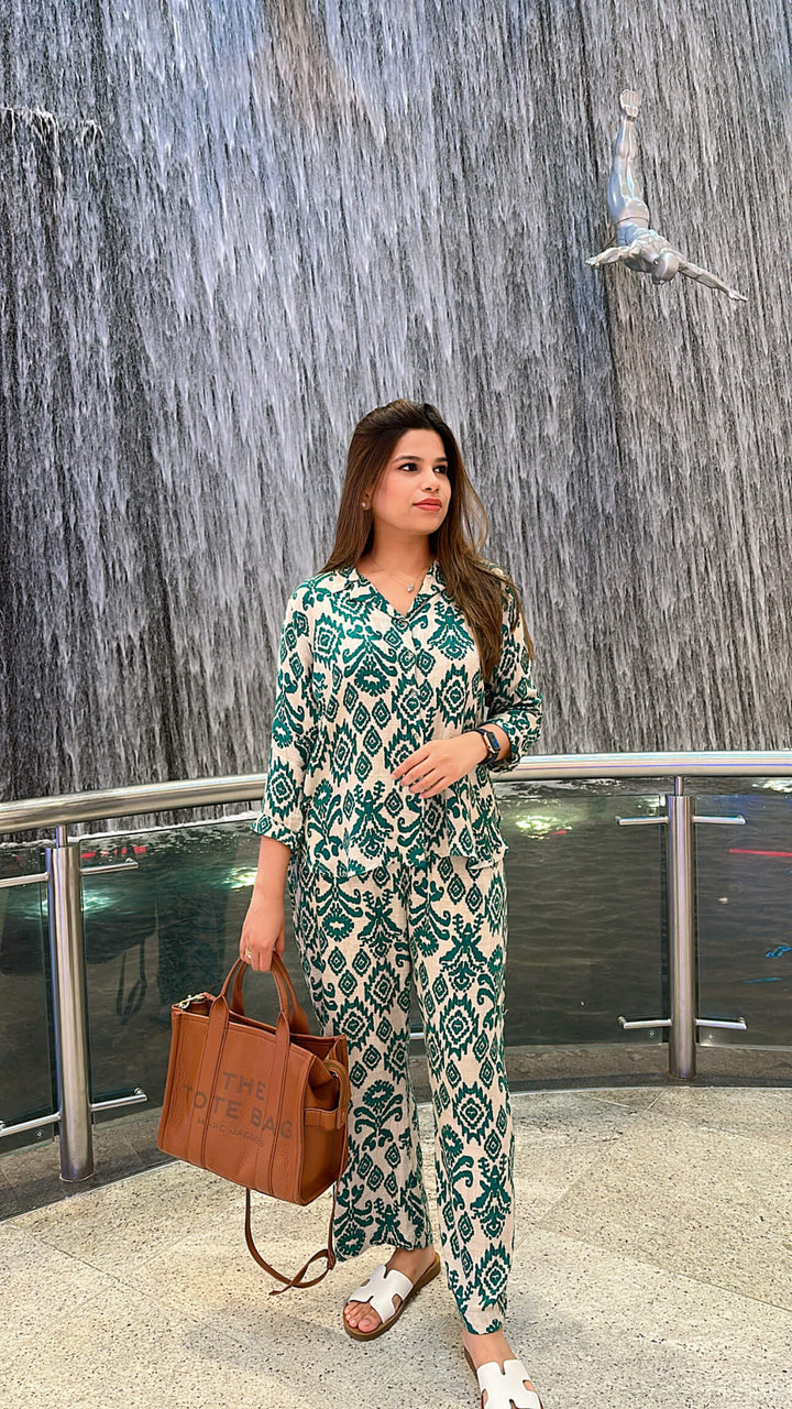 It has Coat collar neck, button down shirt with culottes pants.Shirt length: 28"Pant length: 38"Sleeves length: 18"Fabric: Irish Rayon