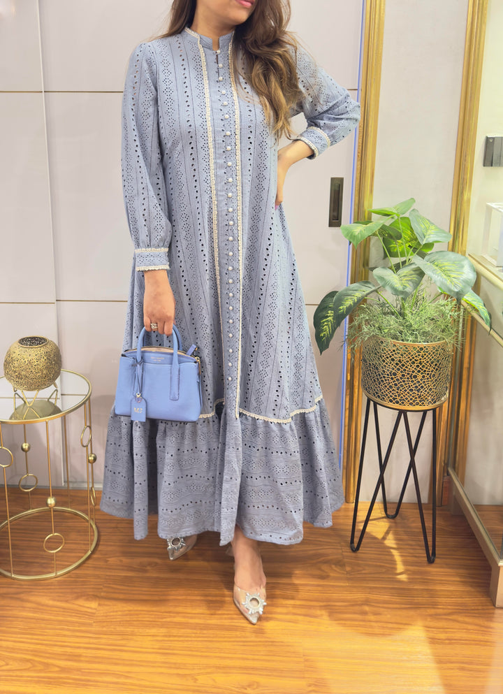 A banned collar chicken kari dress made with pearl and lace detailing. It has cuff sleeves and gathers above the hem.