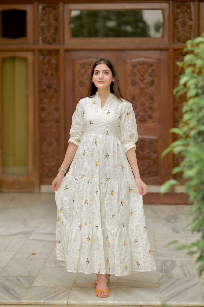 Easy breezy summer outfit for this season. It has a banded collar with three tiers. Comes with Quarter sleeves.Fabric: Embroidered LawnColor: White