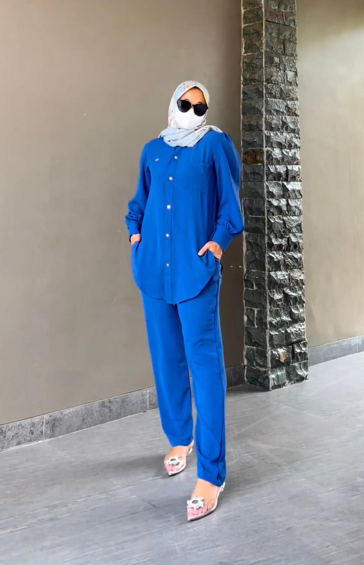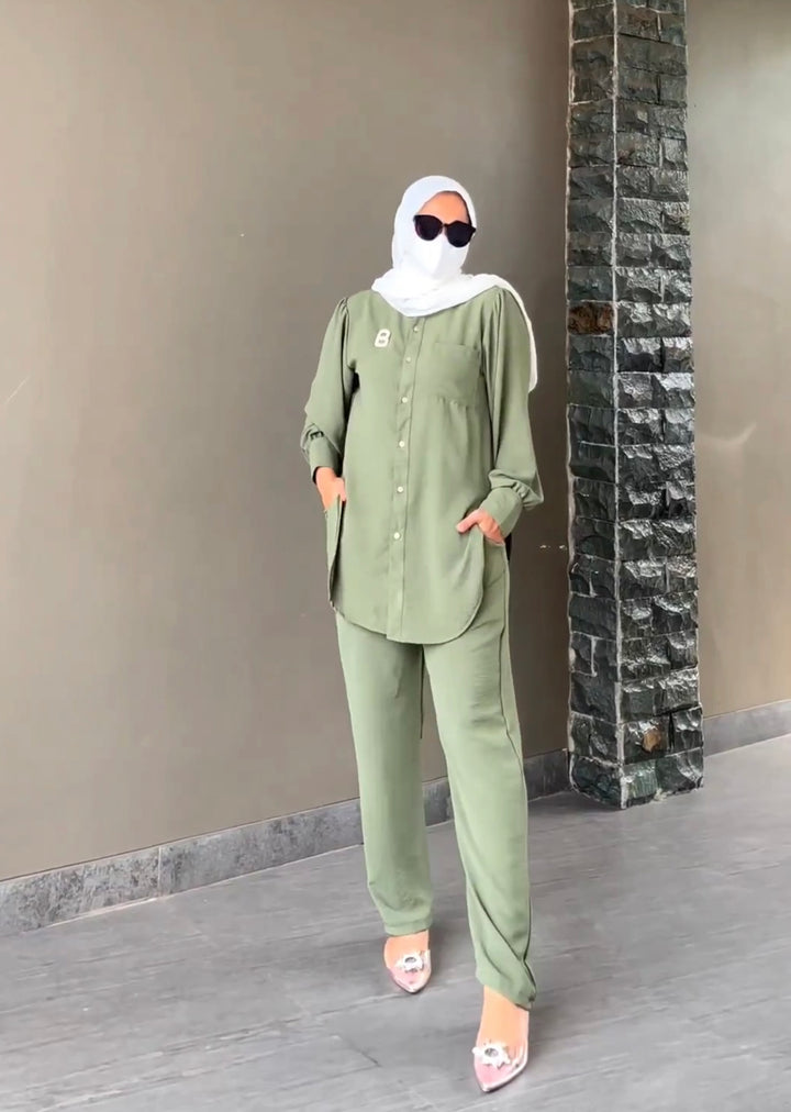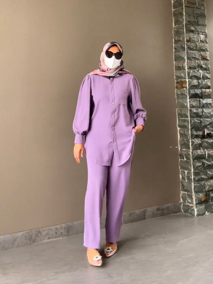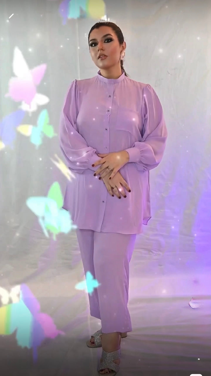 Ban collar button down shirt with puffy sleeves. Comes with a matching straight pants. Fabric: Georgette Shirt Length Front: 32” Shirt Length Back: 34” Pants: 38”