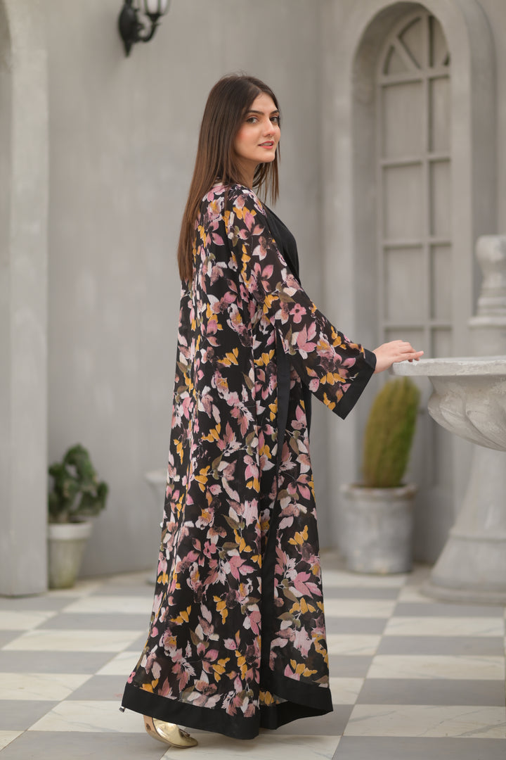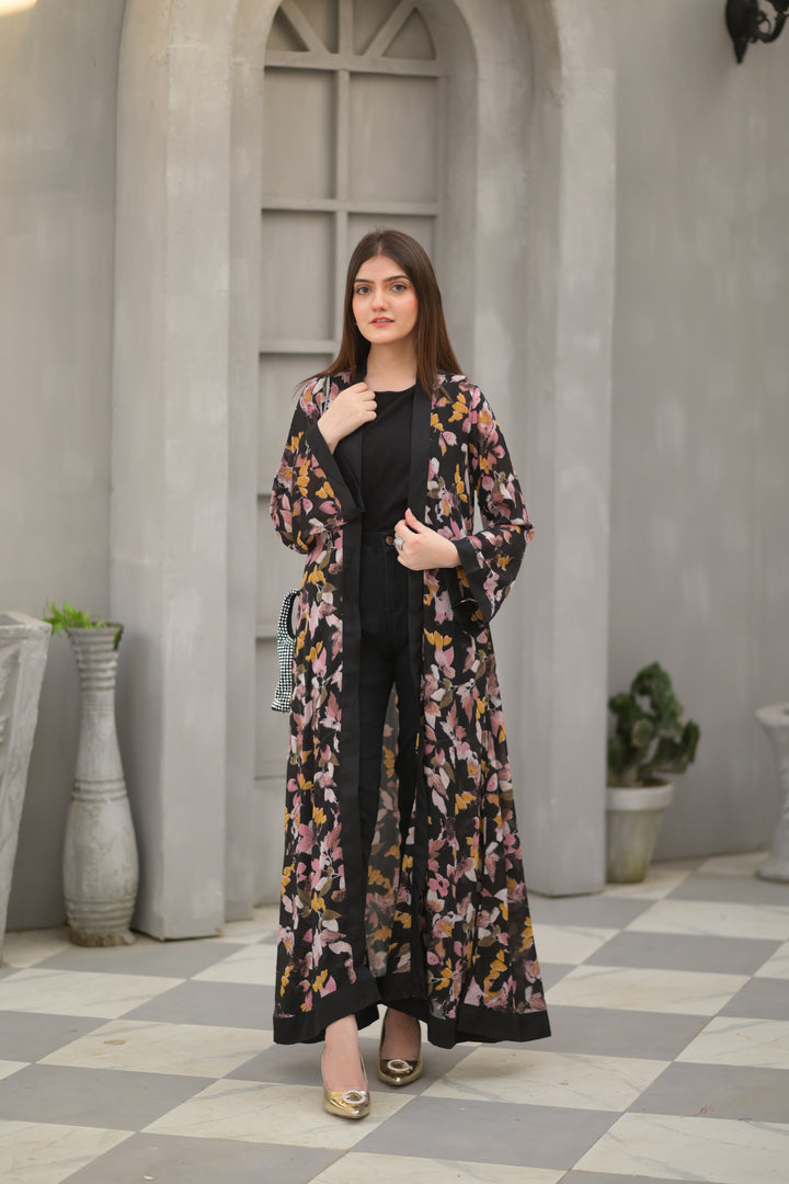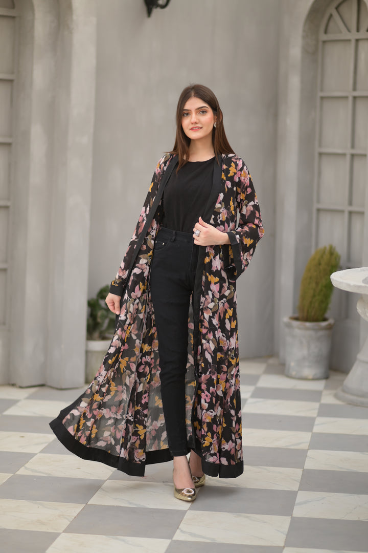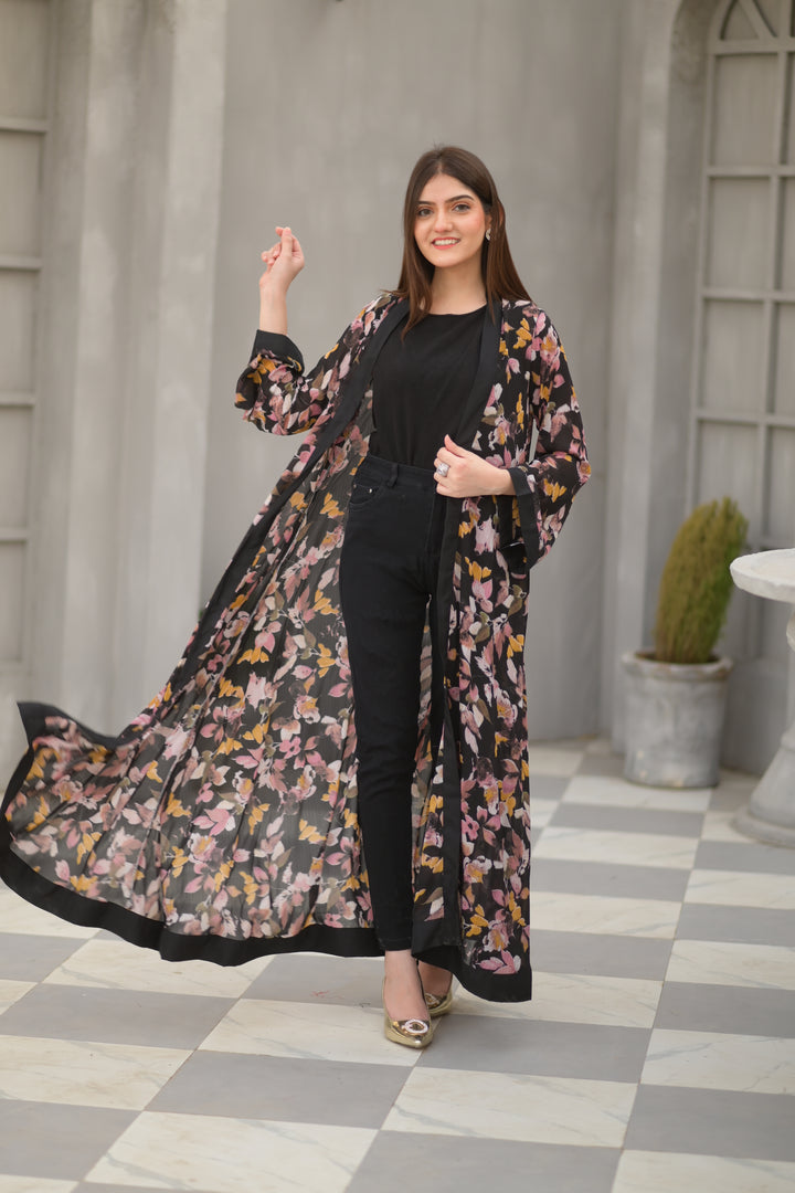 A long kimono with a printed floral pattern and bell-shaped sleeves crafted in lightweight chiffon fabric.