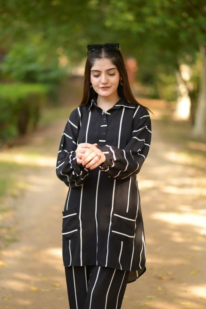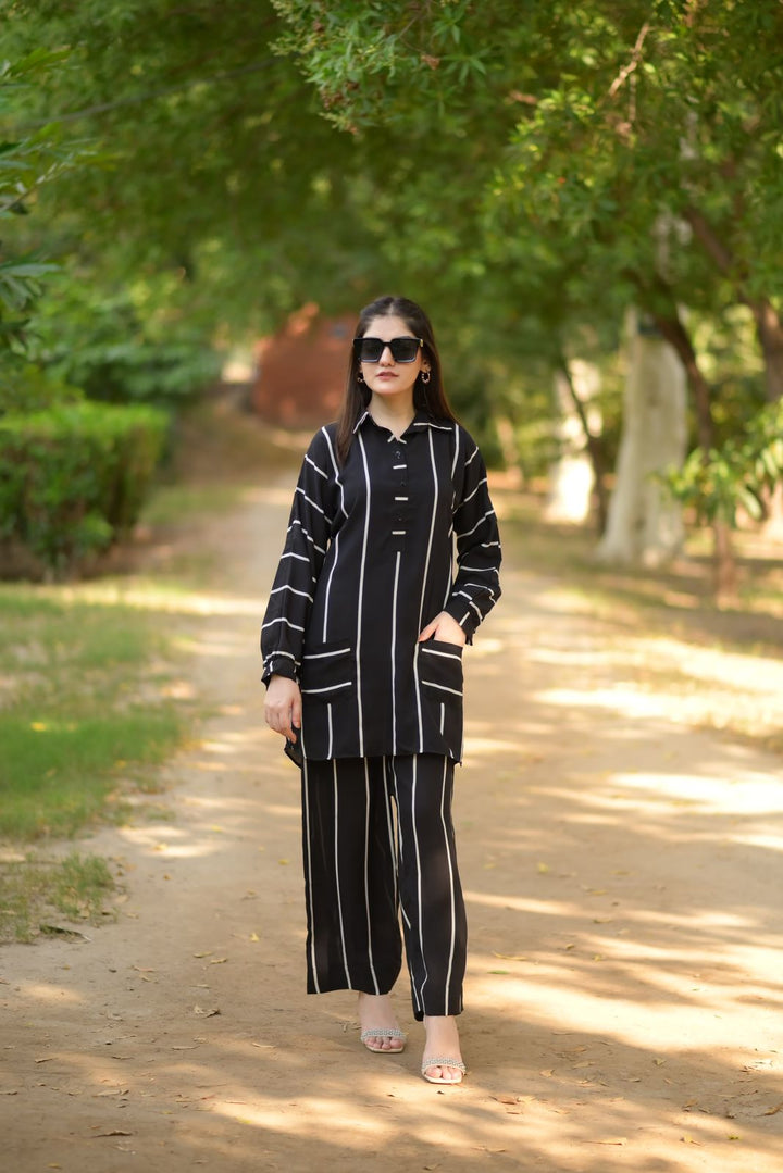 This Black Stripes Co Ord set from features a button-down shirt and culottes crafted from unique georgette fabric. The timeless pattern of stripes creates an eye-catching look while the lightweight, airy fabric ensures comfortable wear throughout the day. Perfect for any season or occasion.