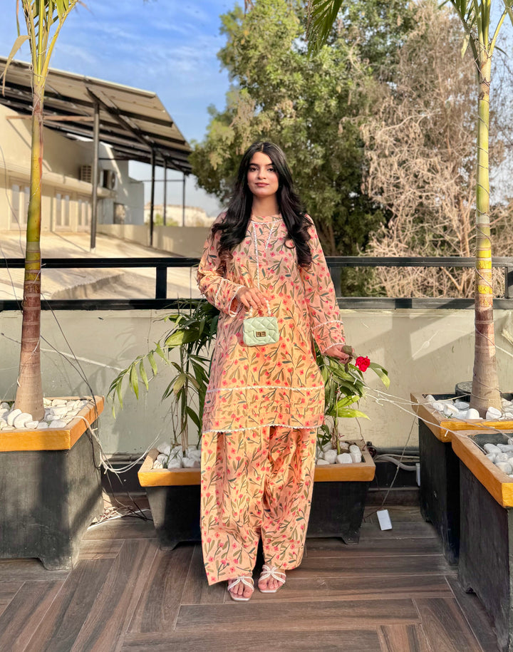 Perfect spring color of peach and pink in brochia lawns stitched with intricate detailing of laces and pleates. Its a two piece set. Straight kameez is paired with a farshi shalwarShirt Length: 34"-36"Shalwar Length: 40"-42"Fabric: Lawn