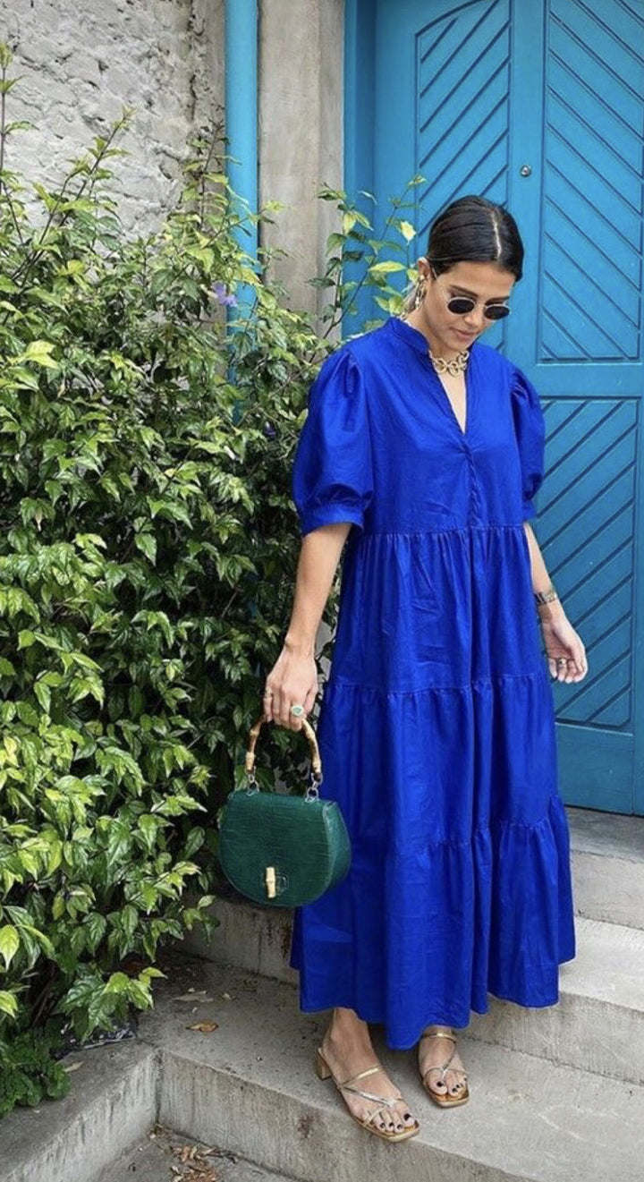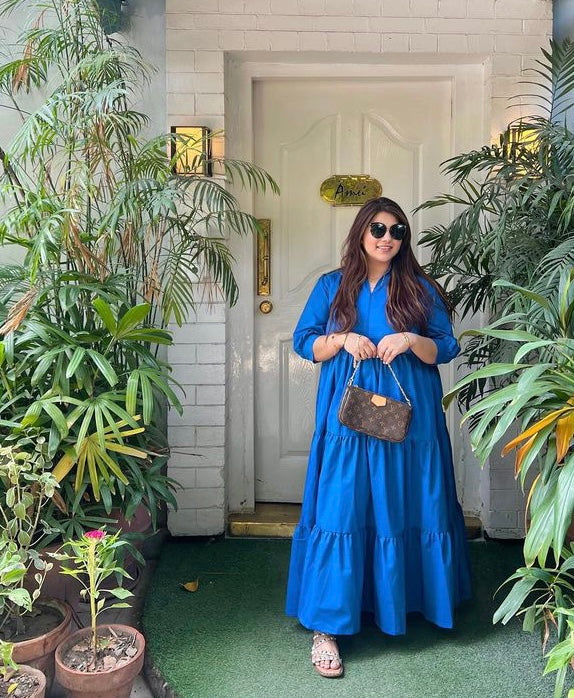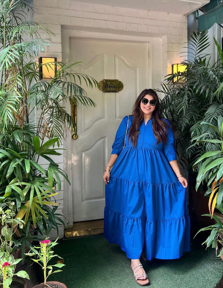 This Blue 3 Tier Dress features a band-collar style with its three-tier flared dress and puffy quarter sleeves. Its breathable fabric and comfortable fit make it perfect for any occasion. Fabric: Cotton Color : Blue