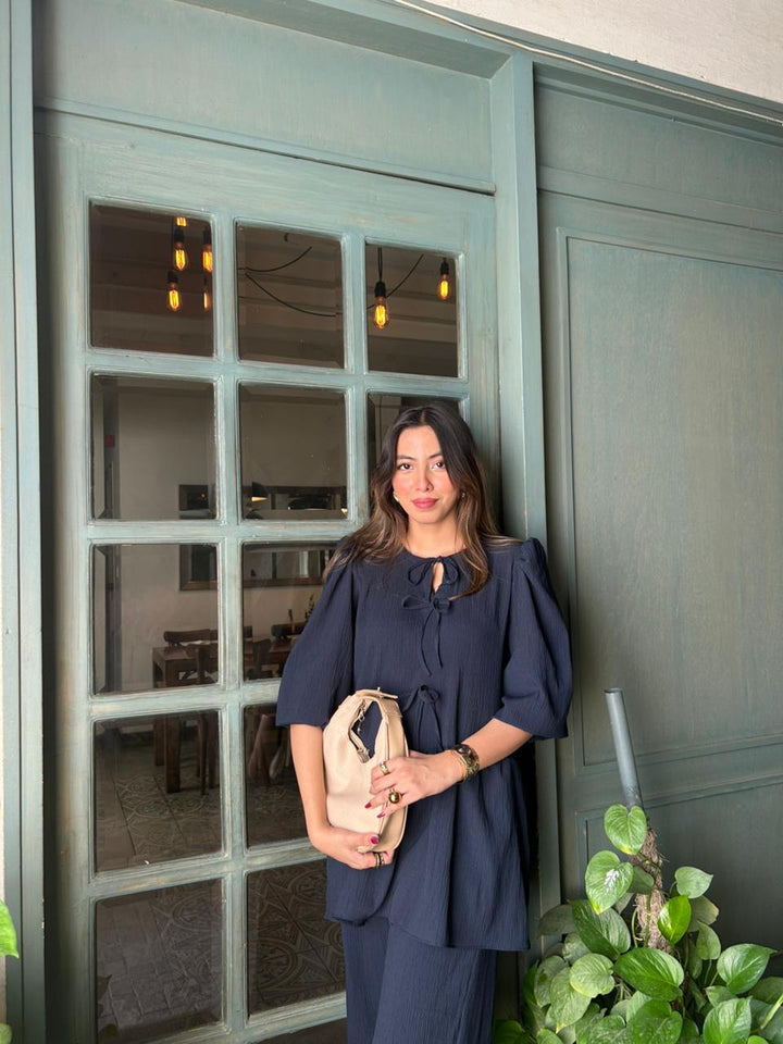 Chic meets charm in this navy blue western co-ord set, designed in soft, flowy fabric for effortless elegance. The shirt features statement balloon sleeves and three delicate bows down the front for a playful yet polished touch. Paired with classic bootcut pants, this set blends feminine details with a strong silhouette.