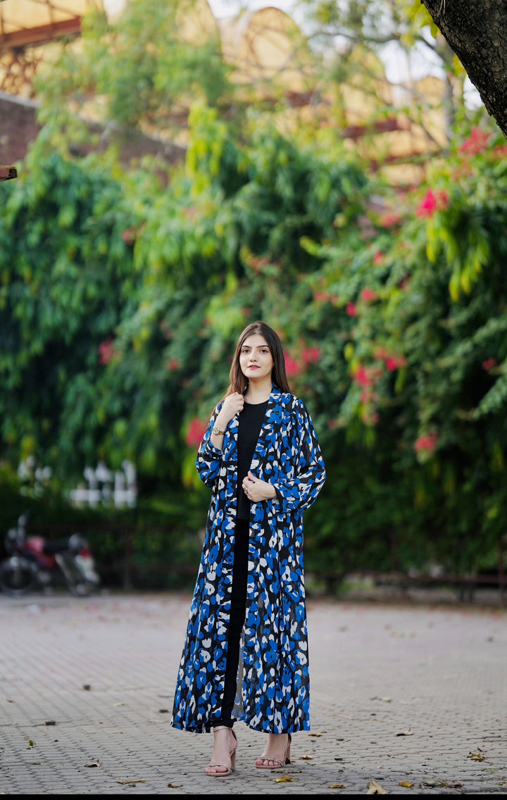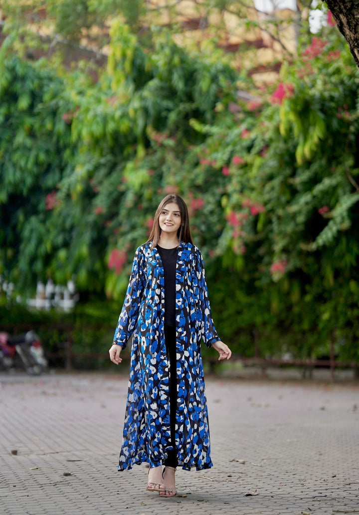 This long-Flared shrug showcases a blue and black panther pattern with straight sleeves to give a chic look.