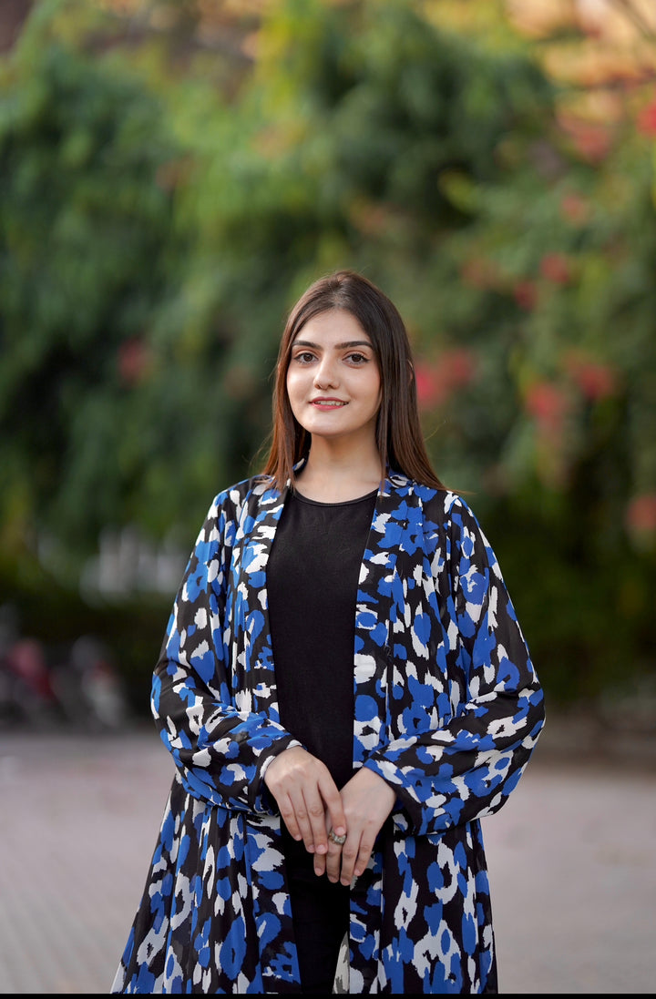 This long-Flared shrug showcases a blue and black panther pattern with straight sleeves to give a chic look. Fabric: Chiffon