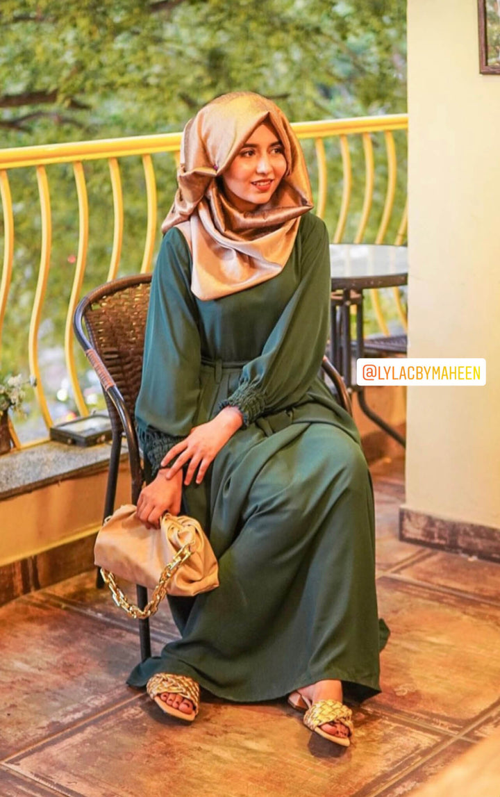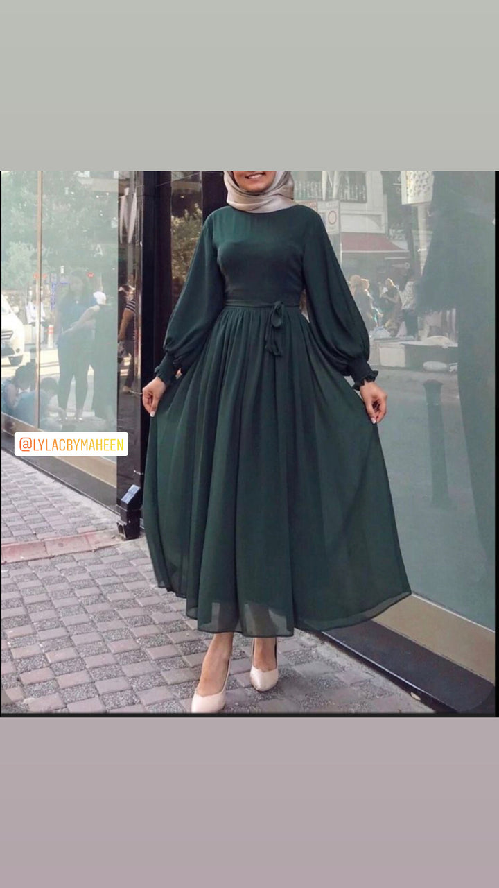 Boat neck style with pleated waist and belt. baggy loose sleeves with smoked elastic on the wrist. Color : Bottle Green Fabric : Georgette