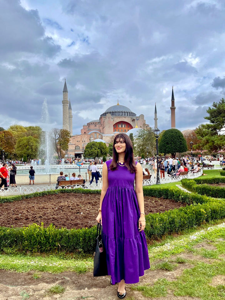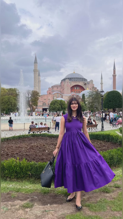 Round neck with bodice. 2 Tier dress with flair. 20” Sleeves can be added, please leave a note for that. Fabric: Cotton Color : Purple