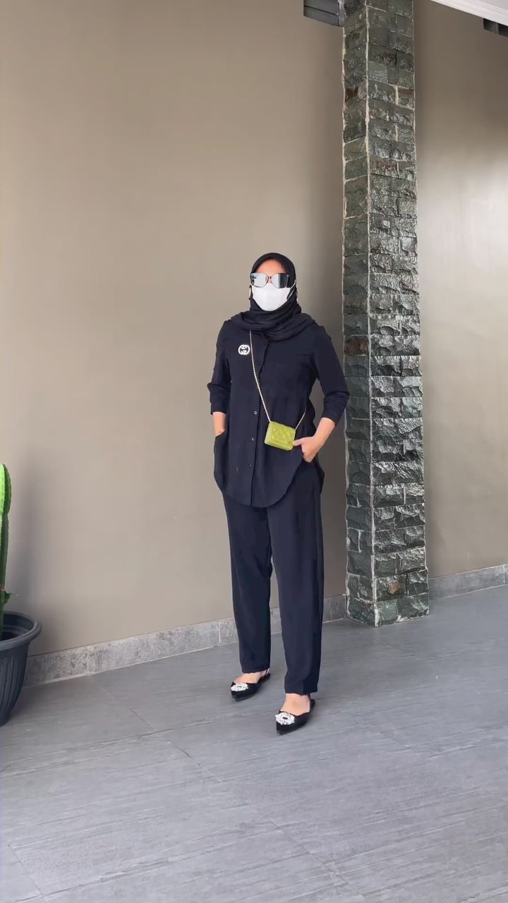 Coat Collar button down shirt with pockets on the body. Cuff Sleeves. Paired with matching Plazzo. Fabric: Georgette