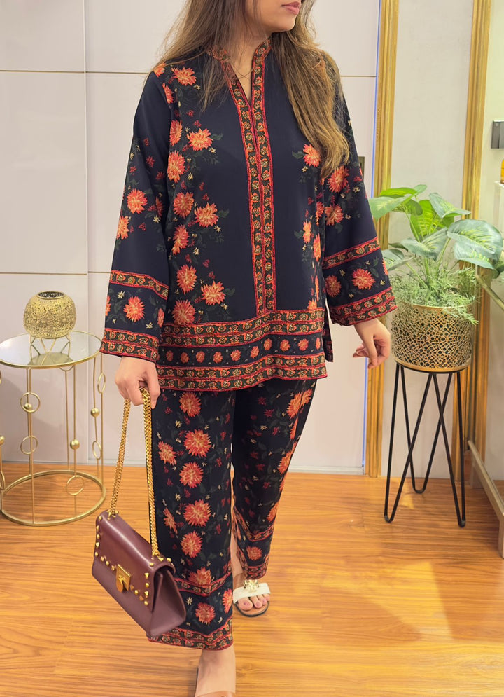 A perfect blend of tradition and modernity in this floral georgette co-ord set. Fabric: Georgette Color: Navy