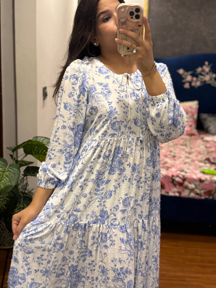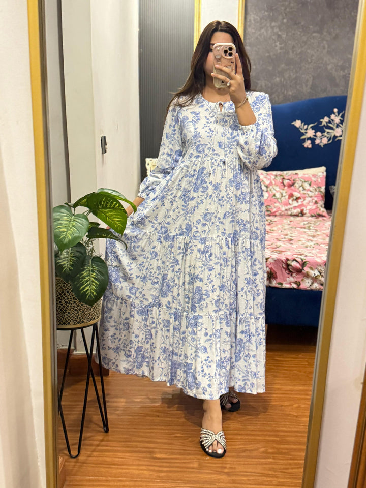 A three tier flared dress with full sleeves (elastic wrist).Neck style is round with a dori.Length: 50"-56”Fabric: Rayon