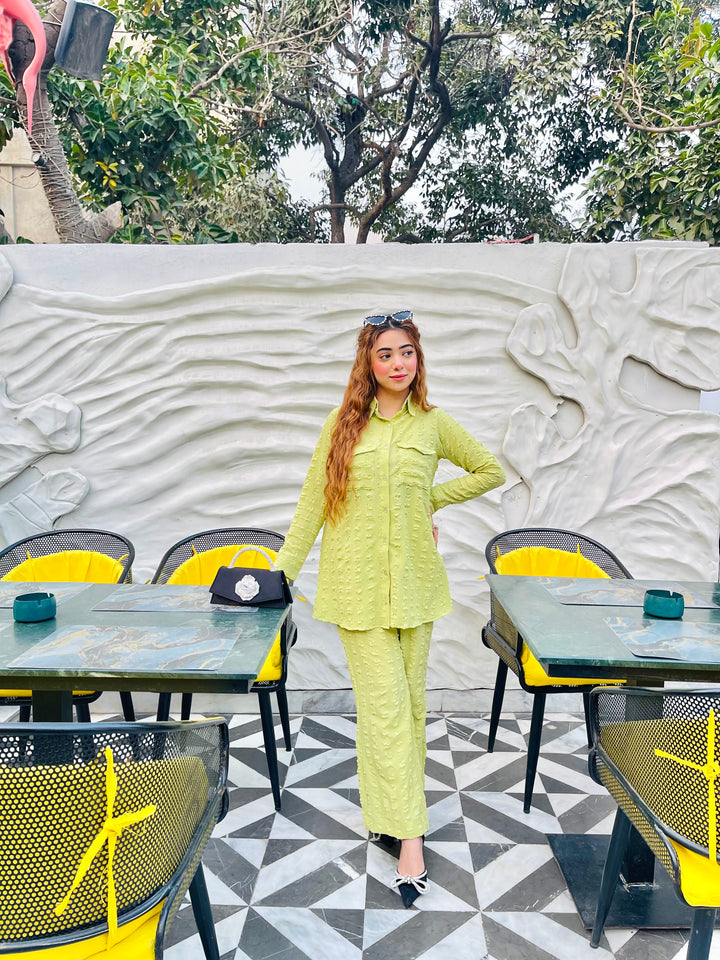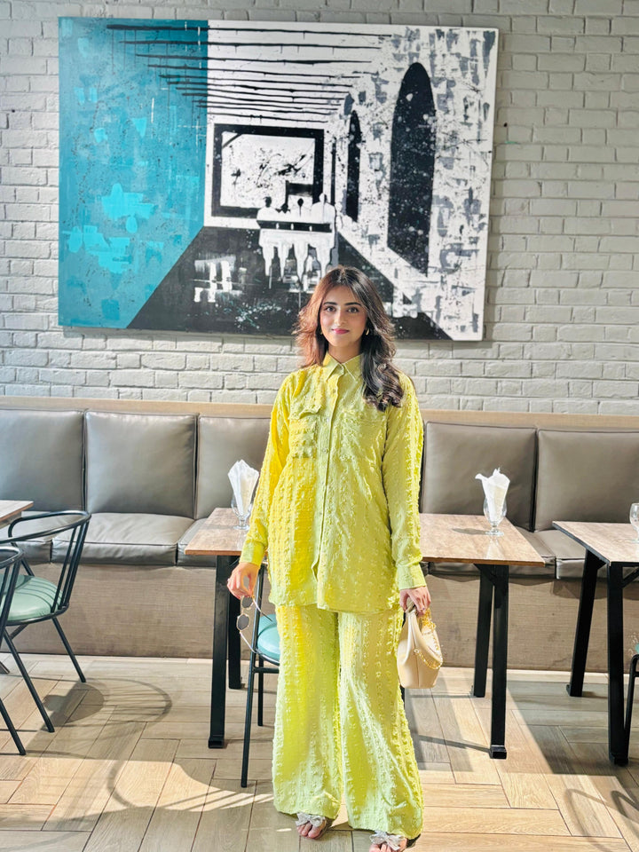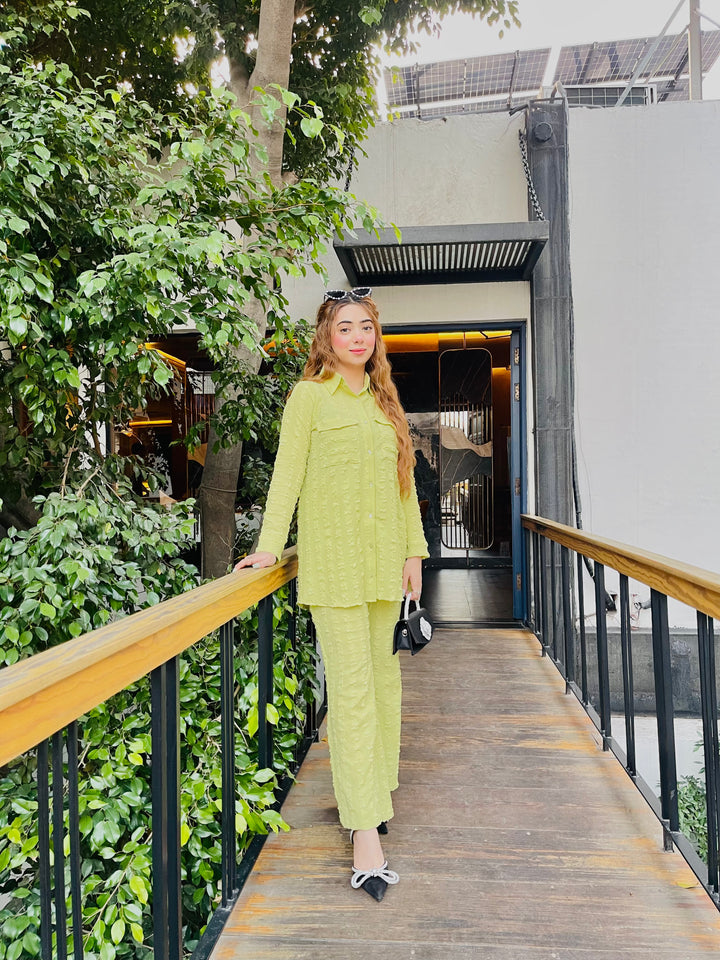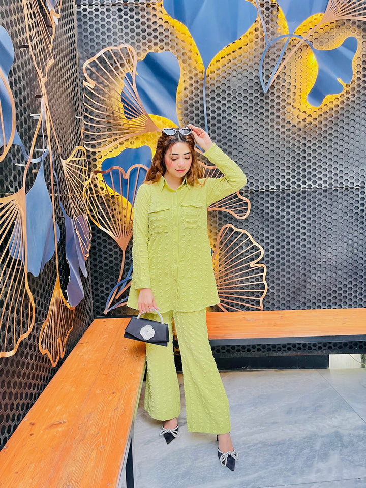 Chic, comfy, and textured to perfection – a button-up shirt with pockets paired with effortless culottes. Shirt Length : 30"-32”Pant Length: 39"-40”