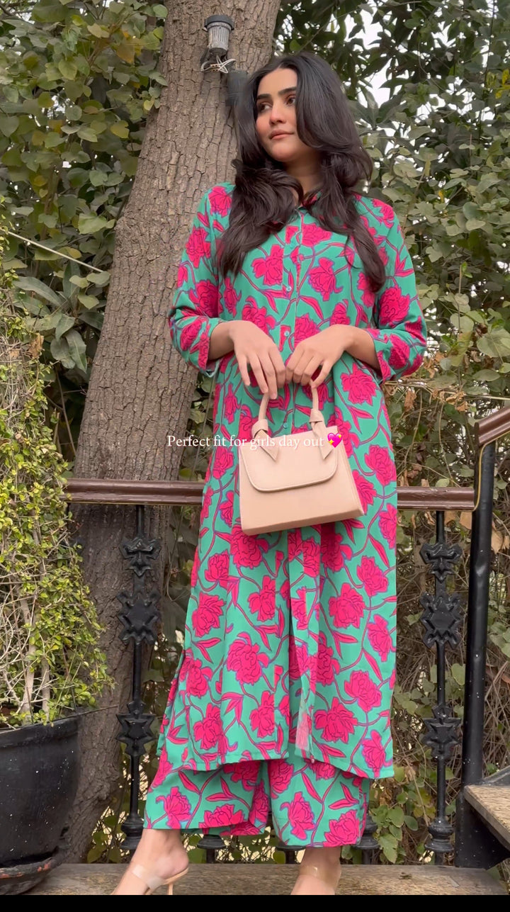 Its a collared neck & button down long ,loose cut shirt. Straight full sleeves for the sleek look. Paired with straight pants. Fabric: Printed Georgette Shirt Length: Small-Medium 48” Large - XL 50” Pants Length: 38-40”