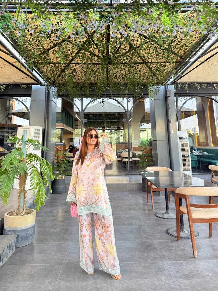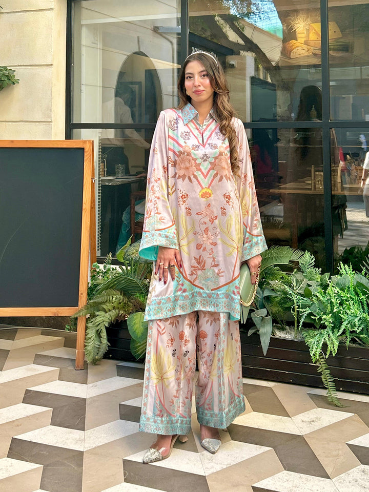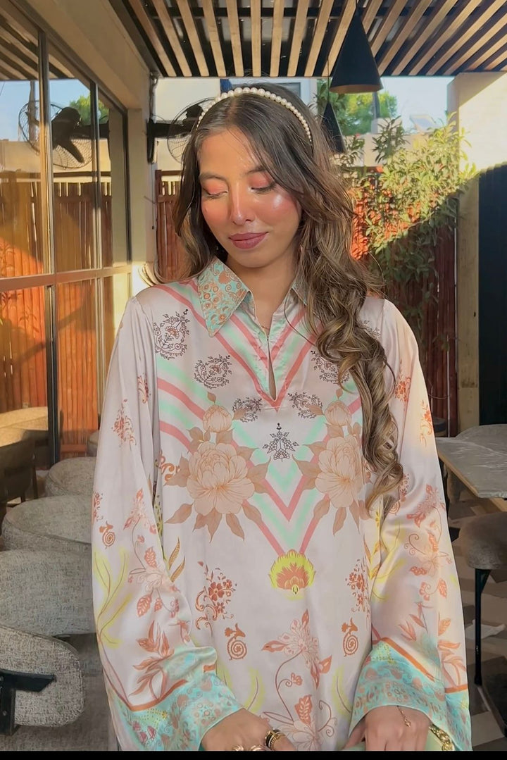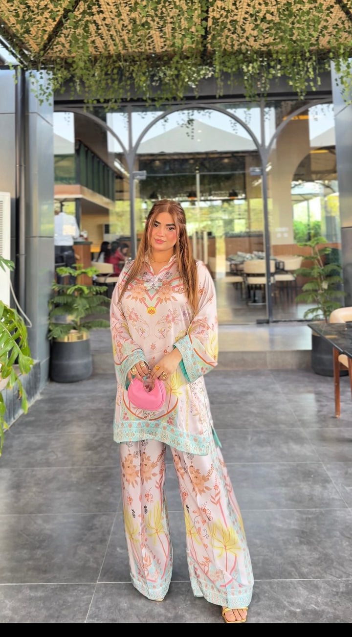 A dream cream silk shirt splashed with soft green, Ferozi palms print giving a chic look with vertical print Plazzo. Part of our Lush crush collection.