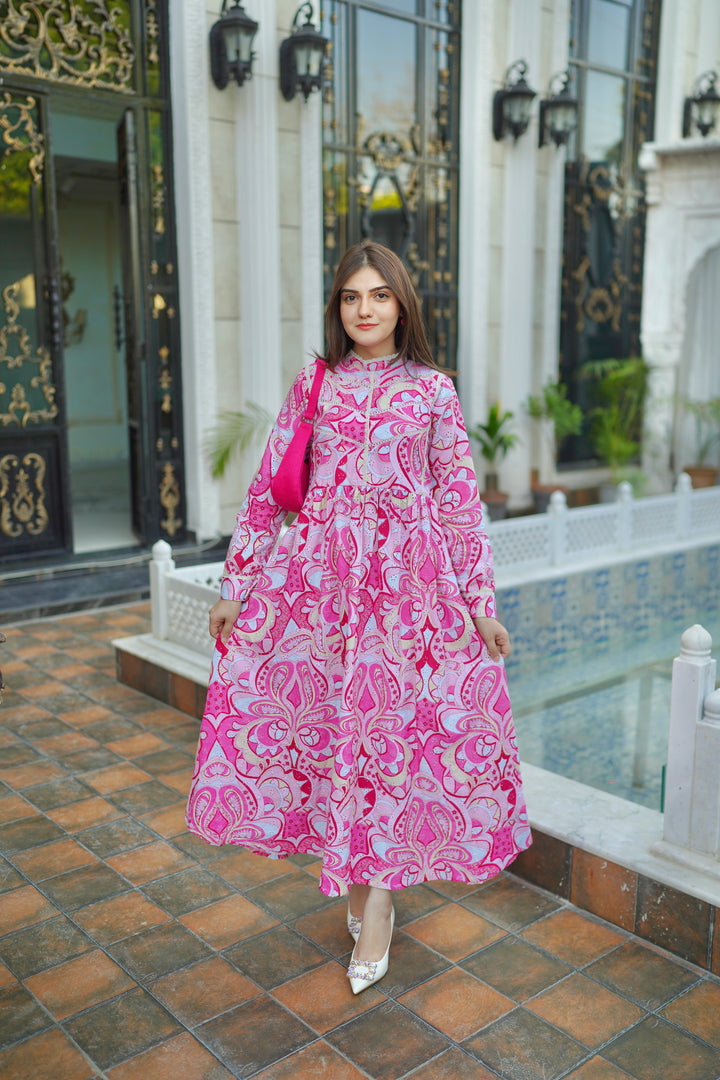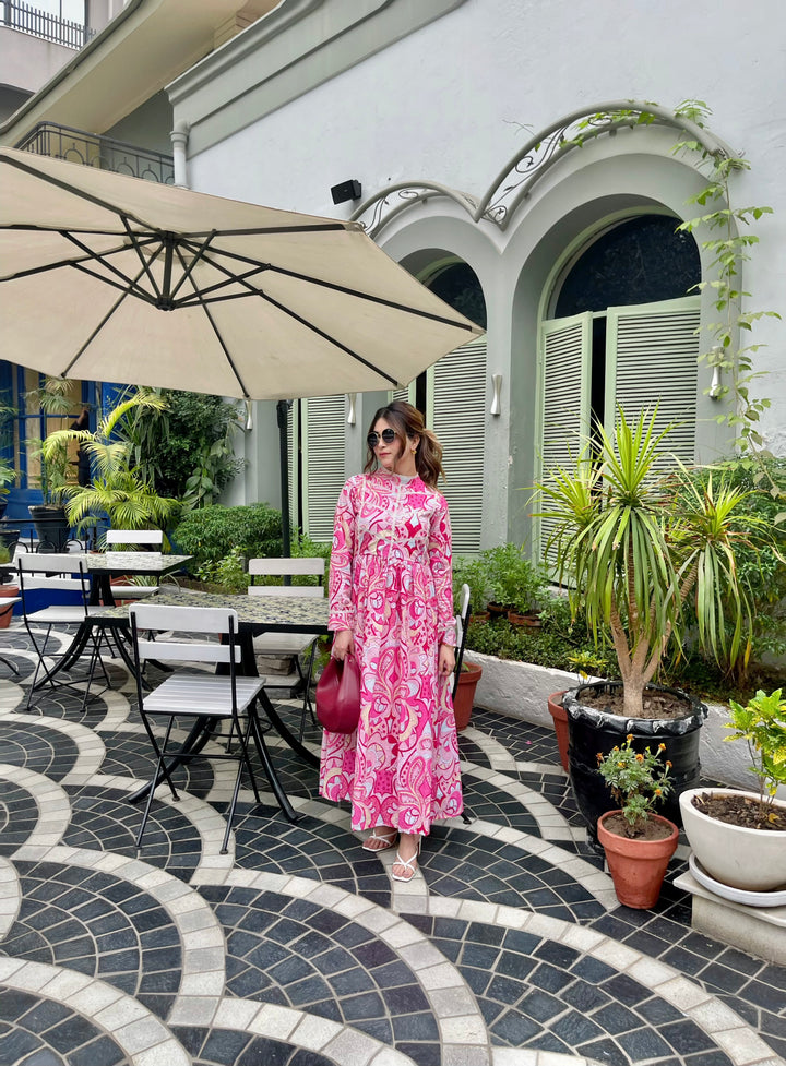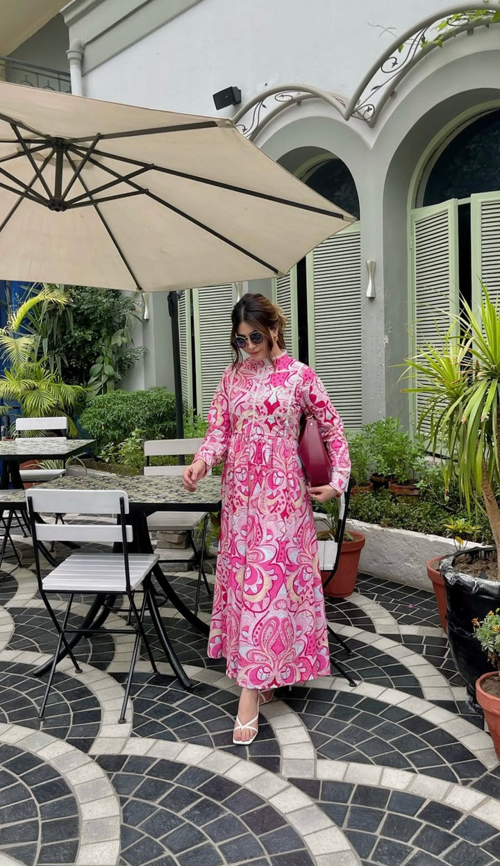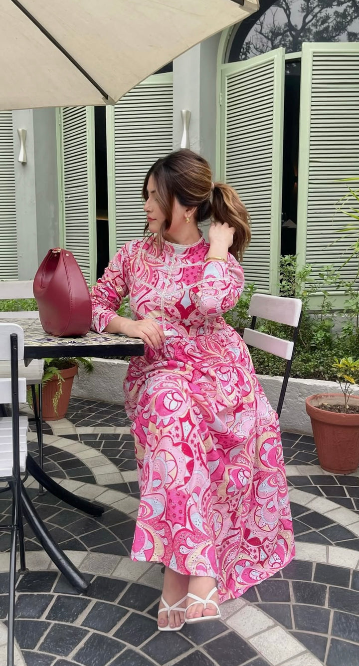 Step into elegance with Jiya ~ A printed pink chicken outfit, delicately detailed with lace work on the bodice, bringing your wardrobe a touch of traditional grace with modern flair. Fabric: Chicken kari and lining attached.