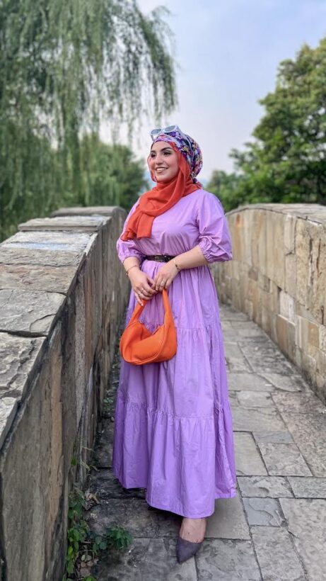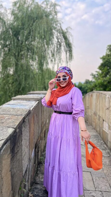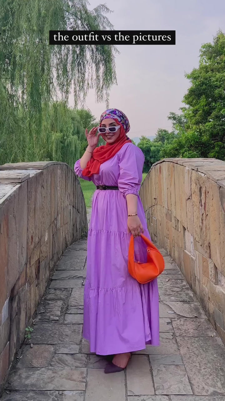 3-Tier Dress with a small round neck. Baggy sleeves with elastic. Fabric: Cotton Color: Lilac