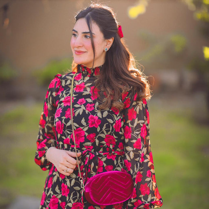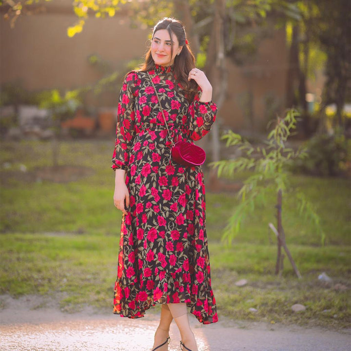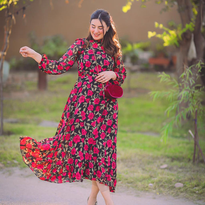 Neck style: Smoked mock neck Dress Type: Flared Dress with frills on the hem Sleeves: flowy sleeves with elastic on the wrist. Fabric: Chiffon stitched with lining.
