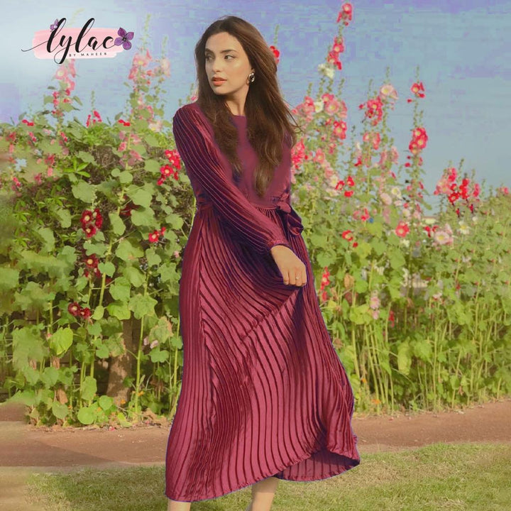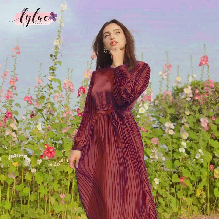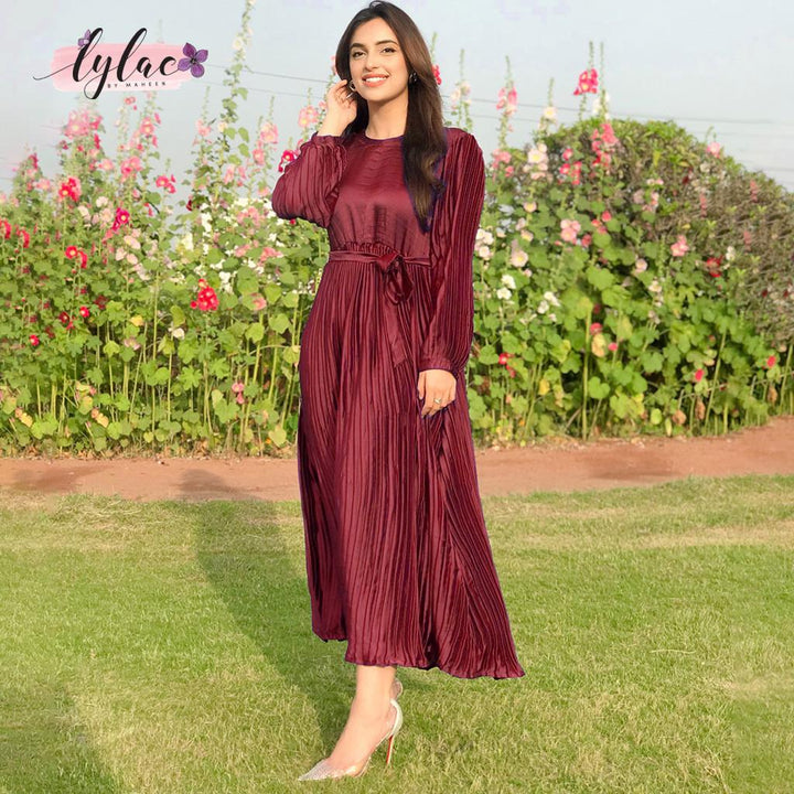 A very deep maroon pleated dress with round neck and belted waist style. Color: Maroon Fabric: Pleated Silk