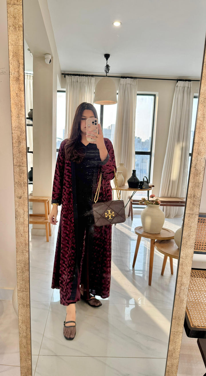 Its a textured Velvet long shrug with full sleeves. Its a one piece.Fabric: Textured Velvet