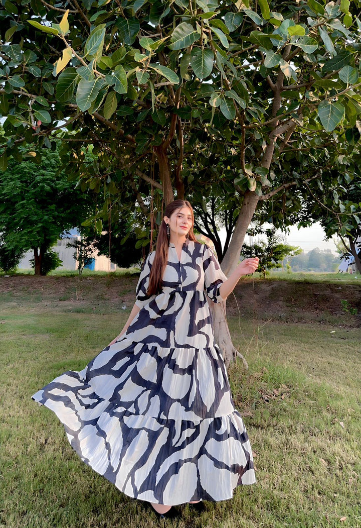 Fabric: Crinkle Silk, Thin and breathable Details: 3 Tier dress with banned collar and cuff sleeves.
