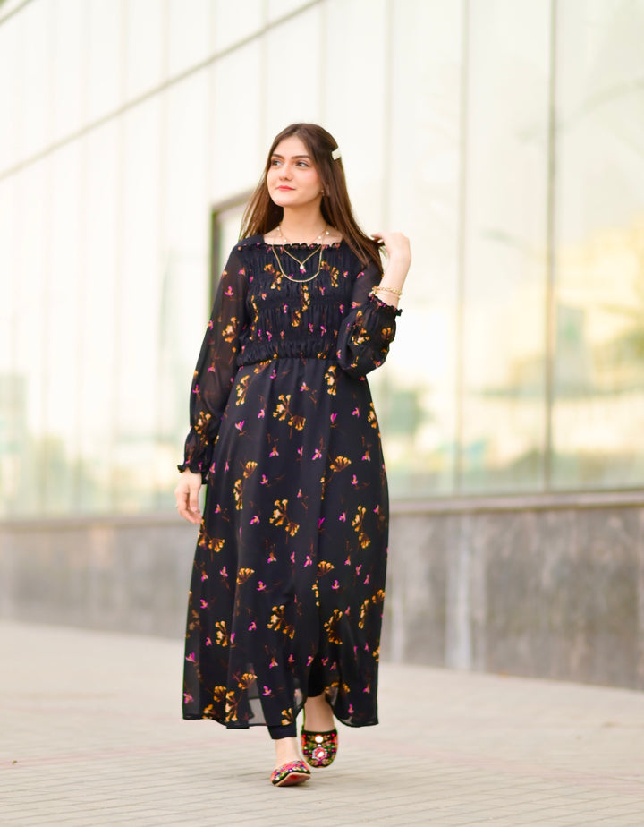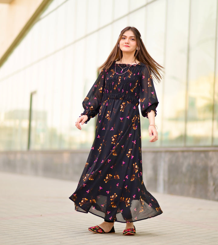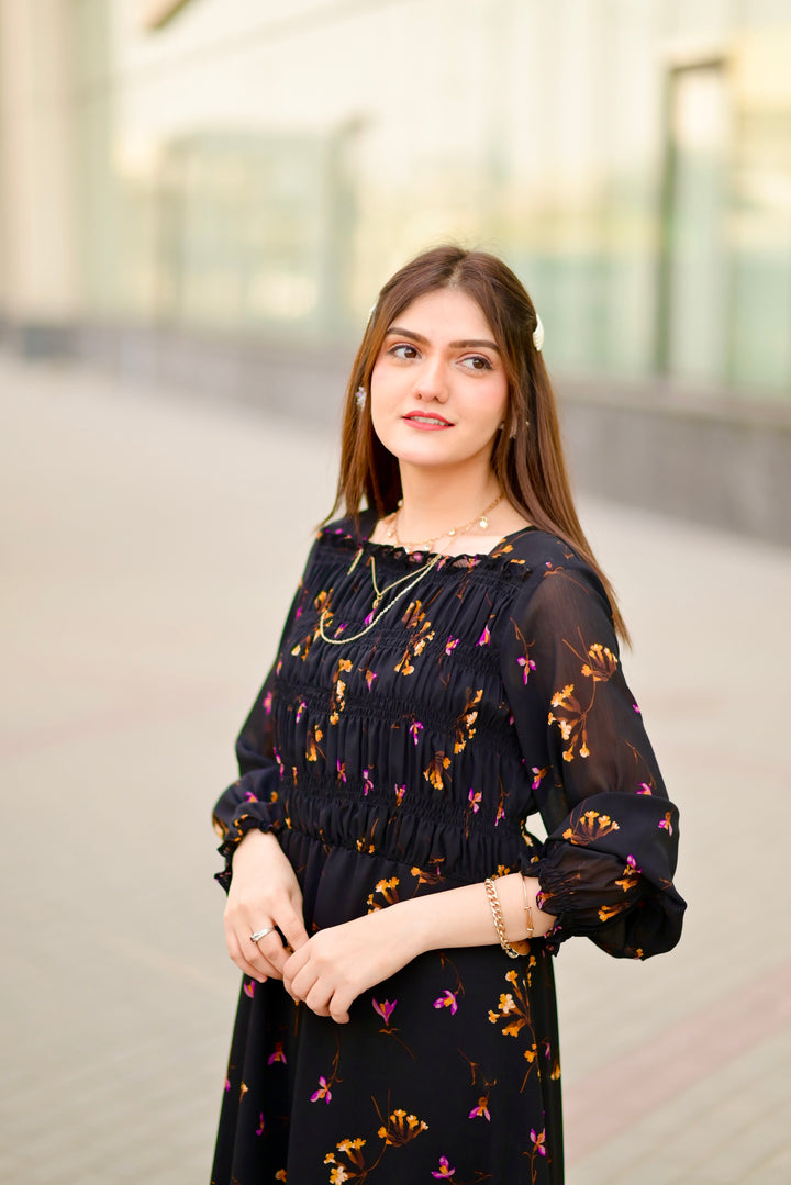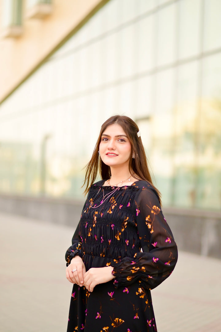 Pretty and Sassy Look in this beautiful black printed dress. It has a square neck style with smoked bodice. Full Sleeves with elastic wrist style. Fabric: Chiffon (Attached Lining ) Color: Black