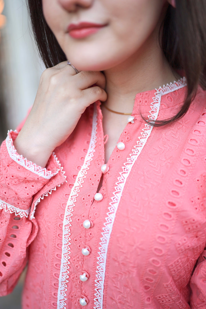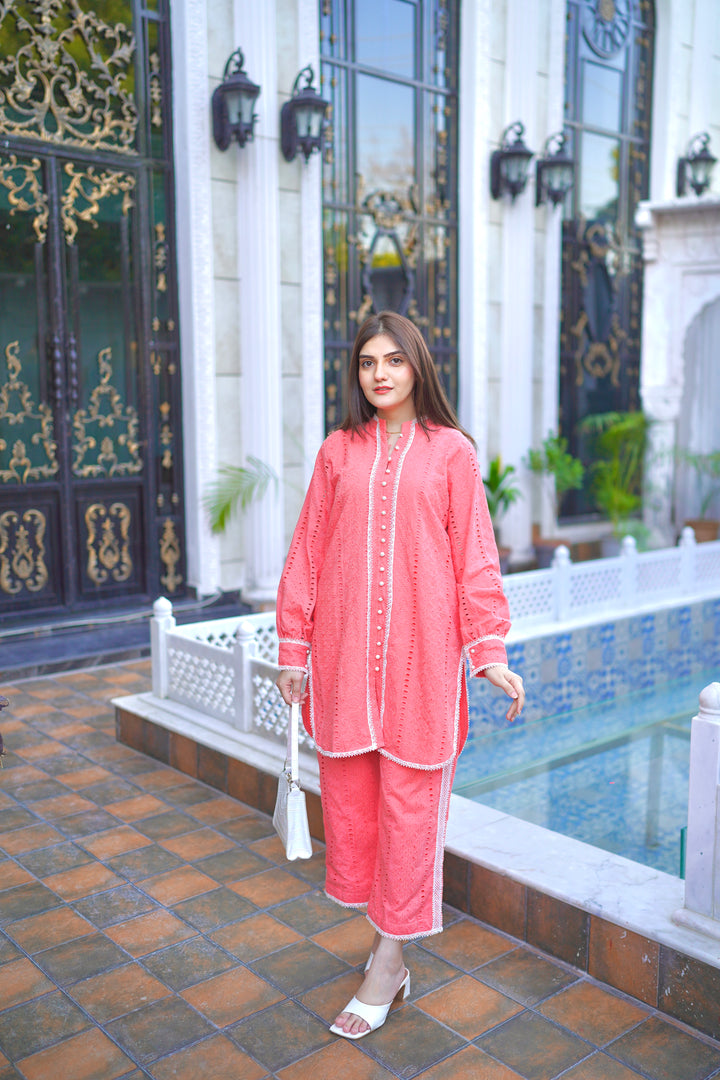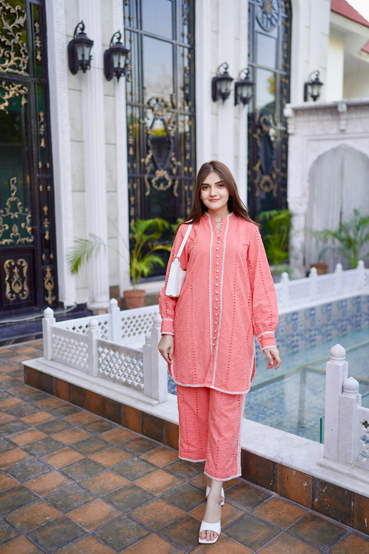 Cluck into style with this charming chicken co-ord set, featuring a ban collar adorned with delicate lace and pearl accents for a playful yet chic touch!Fabric: Chicken (Attached Lining)Color: Peach Shirt Length: 36”Pant Length: 38"-39"