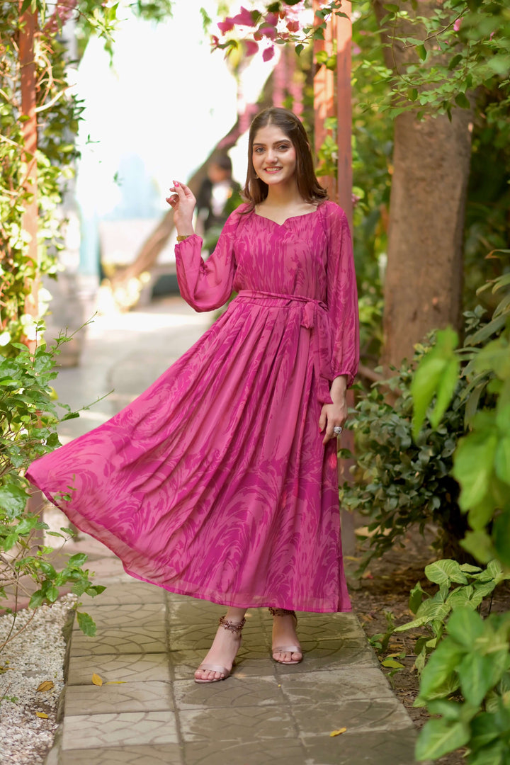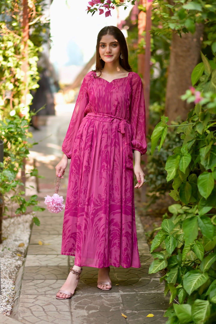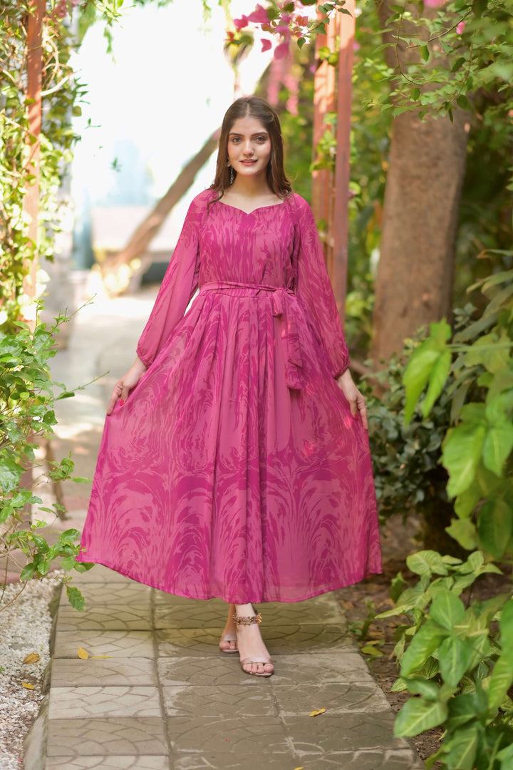 A pinky printed chiffon dress styled with an overlapped neck style. It has a pleated waist with a detachable belt. Fabric : Chiffon Color : Pink