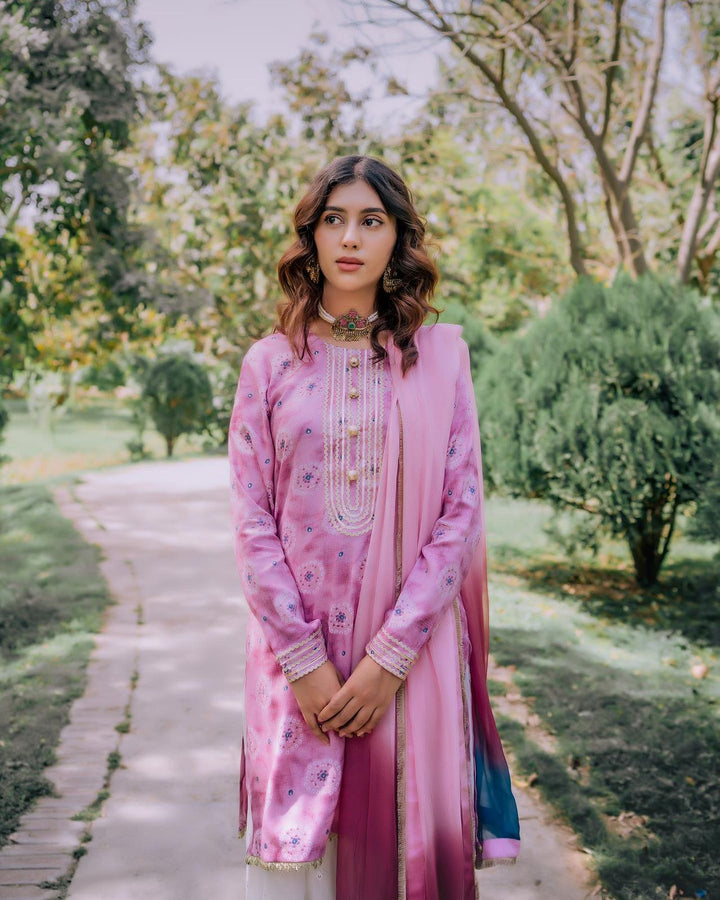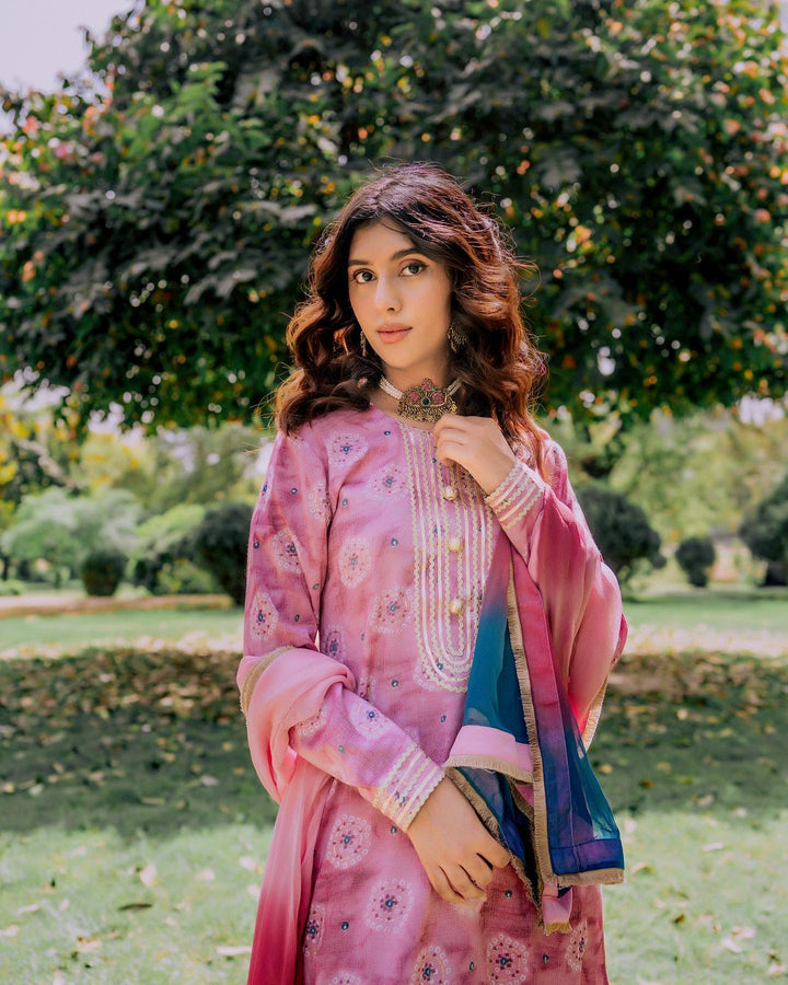 Beautiful chunri print with gota lace work on the neckline and sleeves. Comes with a three-shaded dyed chiffon dupatta and Kiran on all four sides.