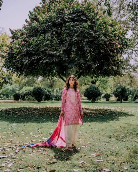 Beautiful chunri print with gota lace work on the neckline and sleeves. Comes with a three-shaded dyed chiffon dupatta and Kiran on all four sides. Shirt: Swiss LawnDupatta: Chiffon