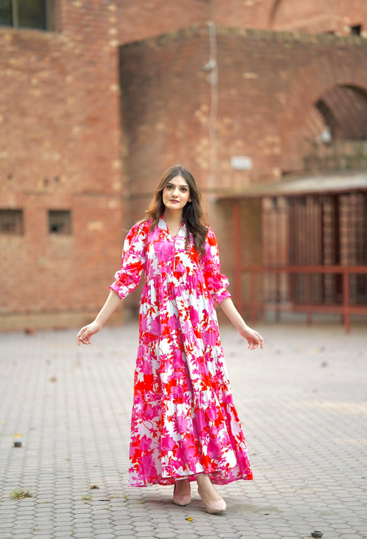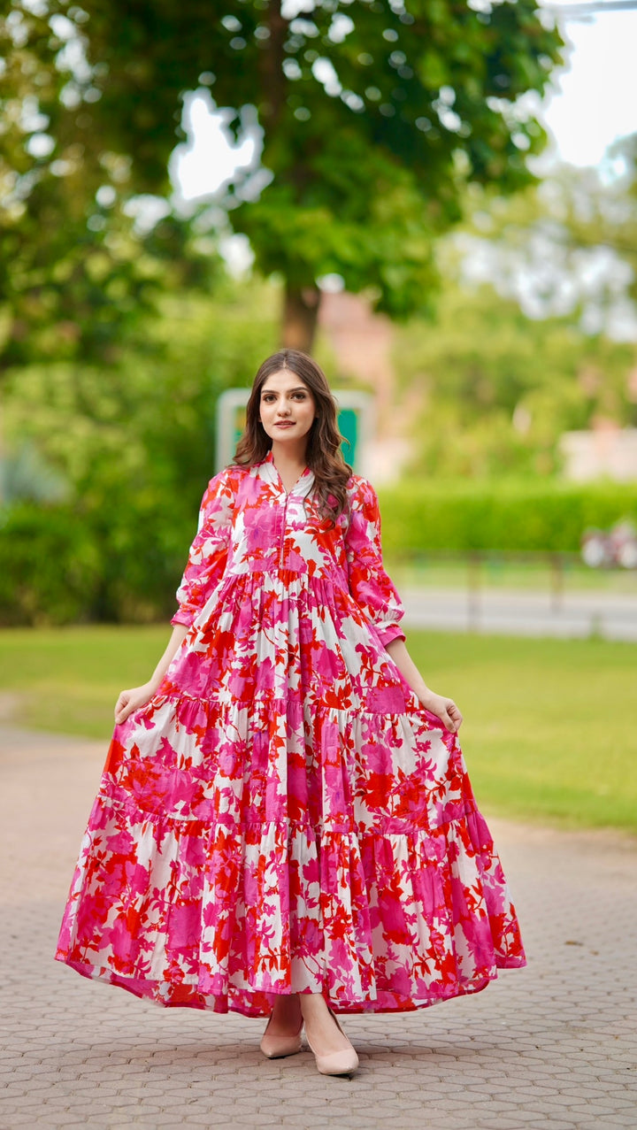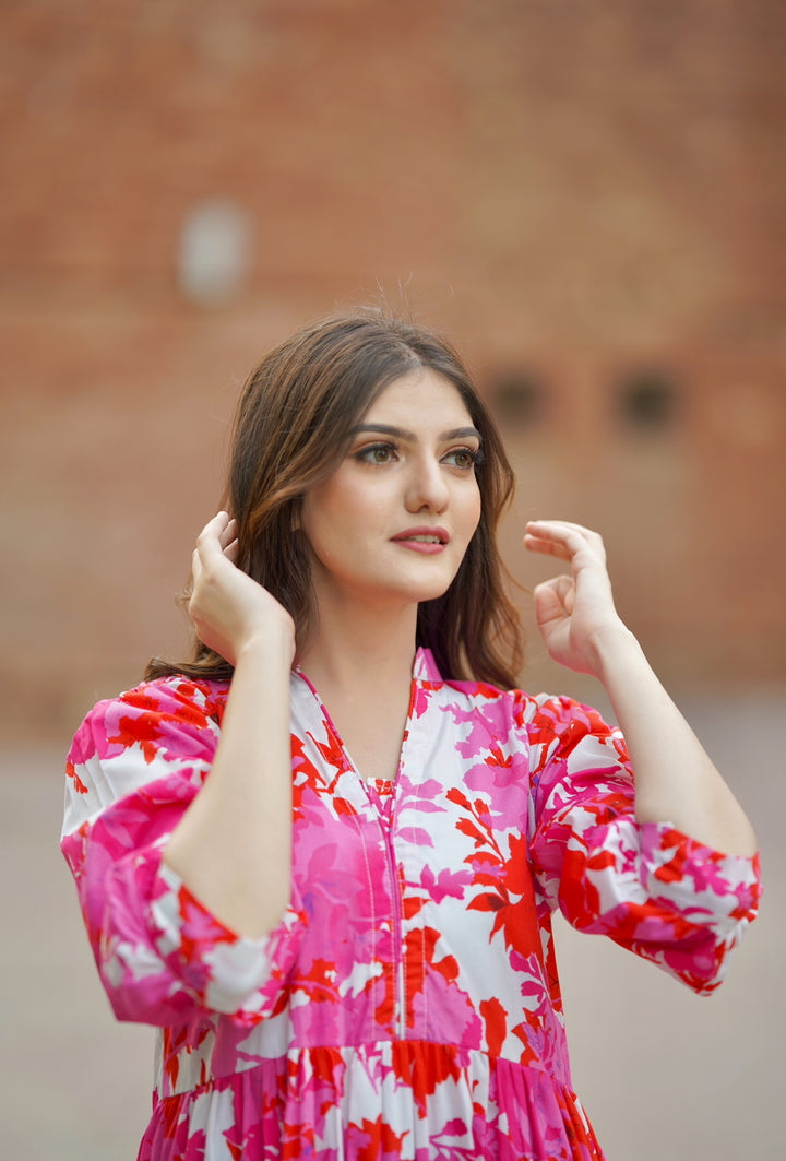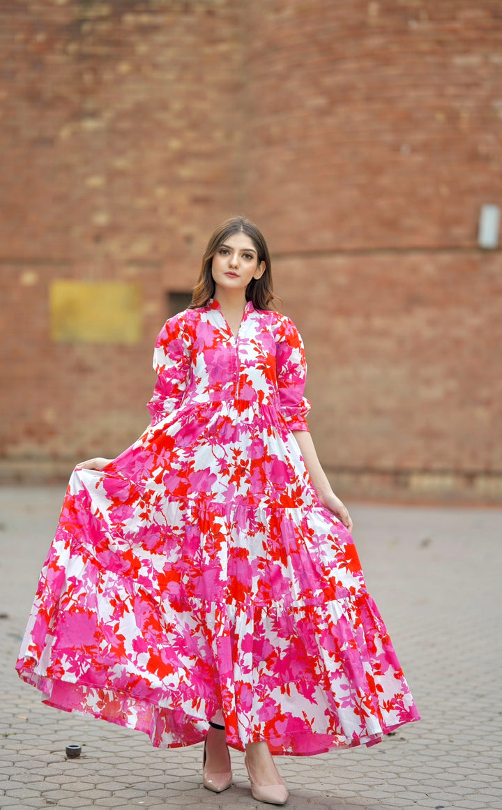 This dress features a lovely pink patterned design with three tiers and beautiful flare.It also has a mock neckline and puffy sleeves with elbow-length cuffs. Fabric: Premium Cotton Color: Pink and White