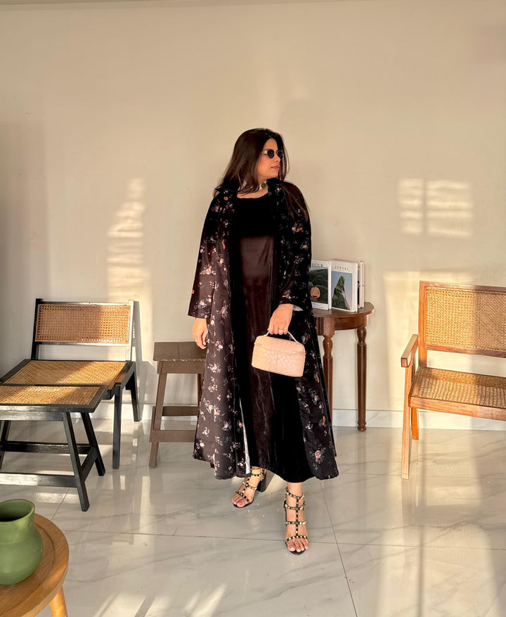 Its a coat collar style long shrug. Its a thick printer velvet. Its a one piece shrug only.Fabric: Thick Printed VelvetColor: Black base