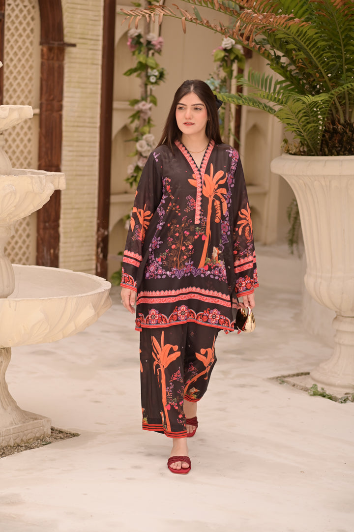 A perfect combo for this fall, bold and basic Black base with Rust Palm tree and floral elements enhancing the pumpkin spice shirt,it is paired with culottes. Its part of our lush Crush collection.