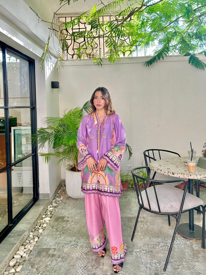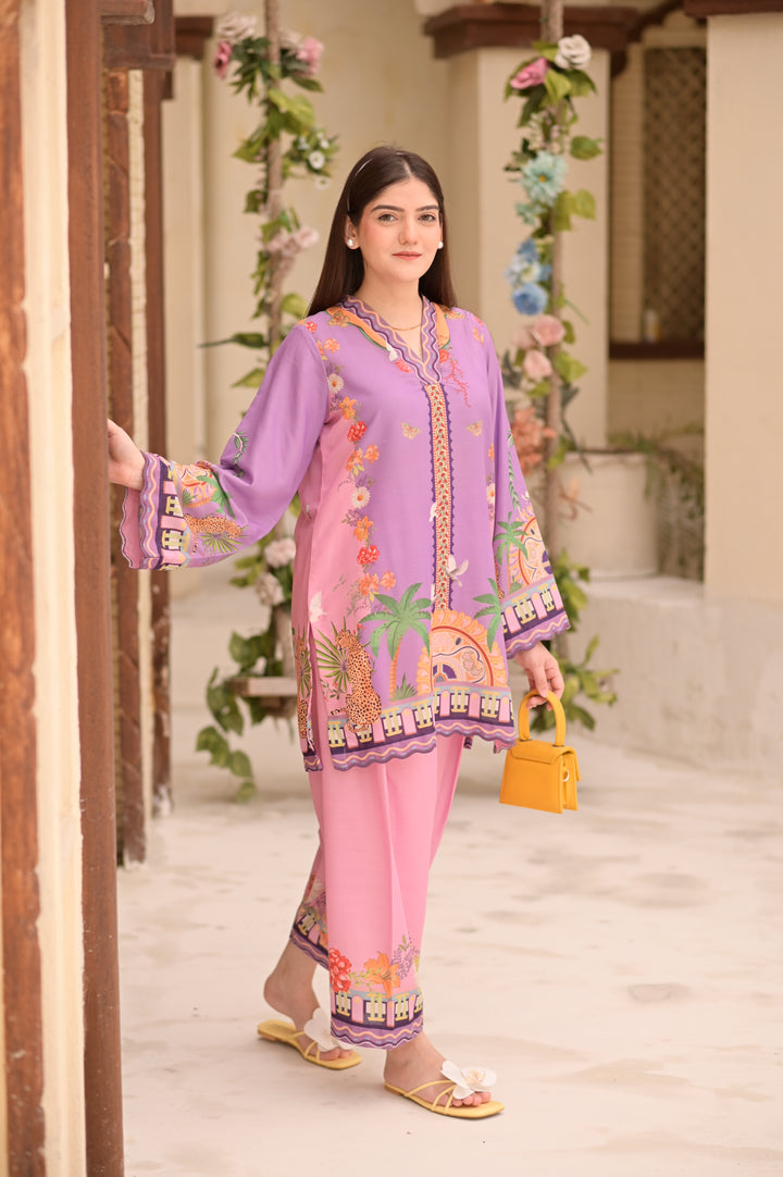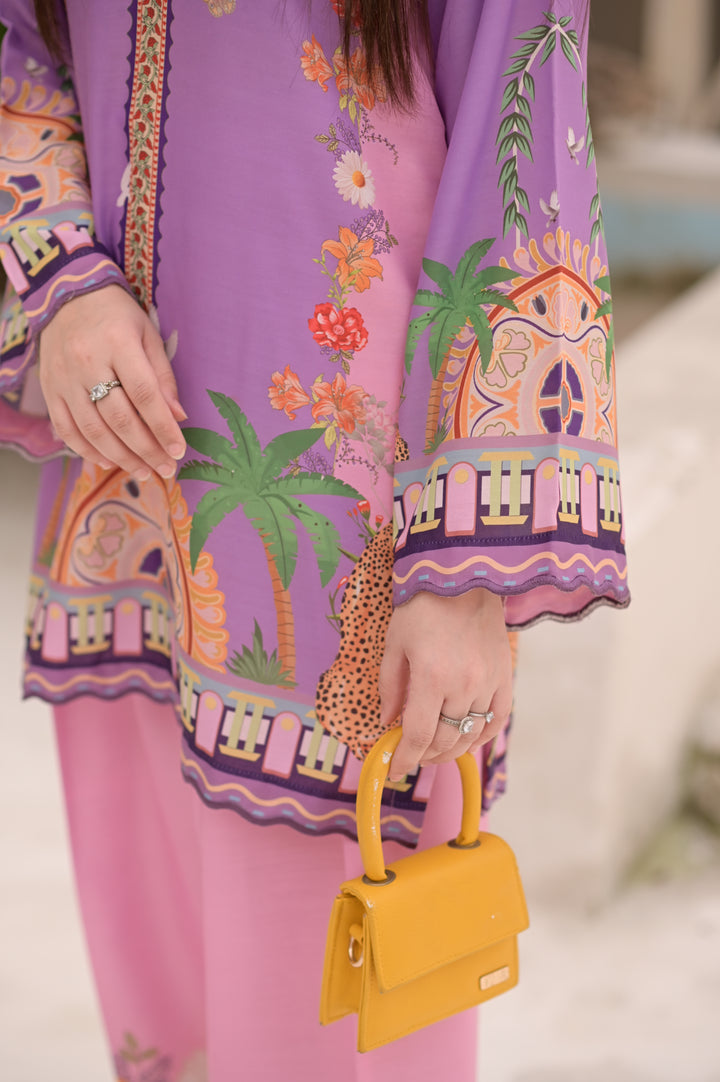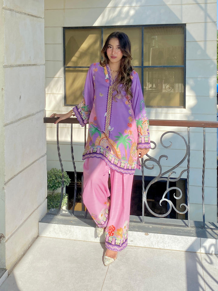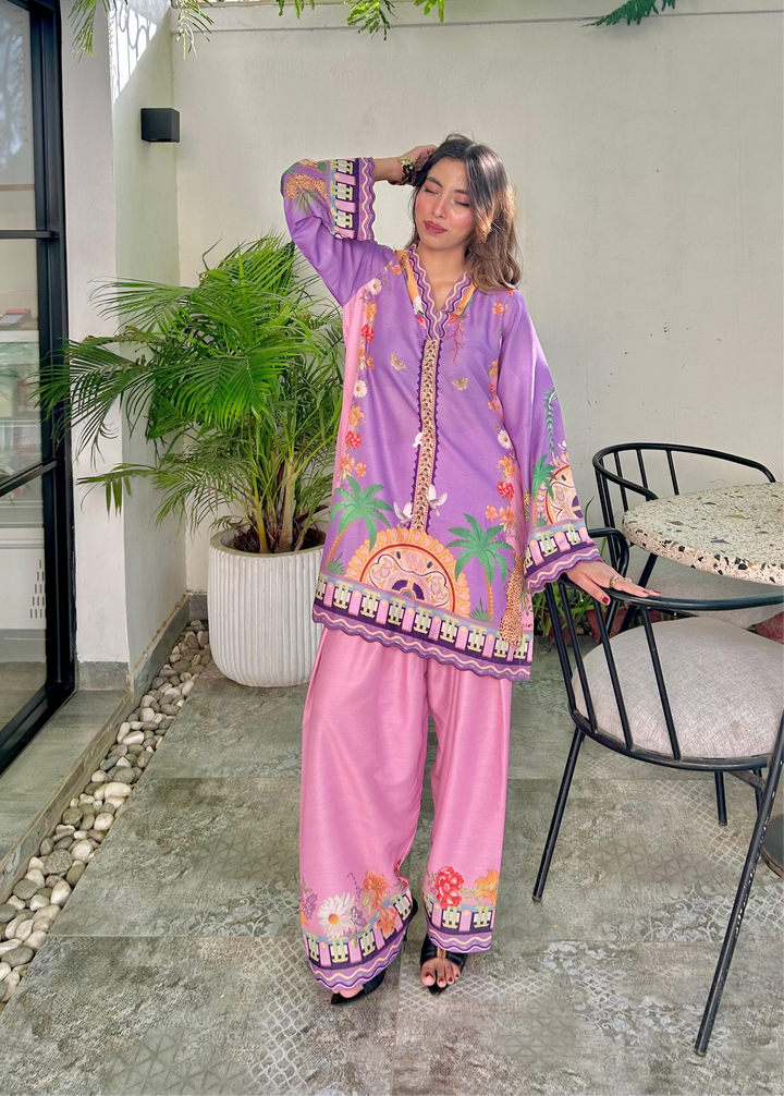 This Rasberry Swirl co-ord is your go-to for Lunch vibes or weekend wins ,Featuring the ultimate combination of palm trees, butterflies and florals pattern. Its an overlap neck style, with wavy cut-work Hem. It is paired with Farshi shalwar.