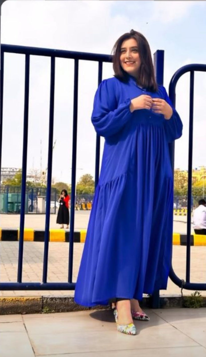 A beautiful flared dress with button on the bodice. It has cuff sleeves and three tier flare. Fabric: Georgette