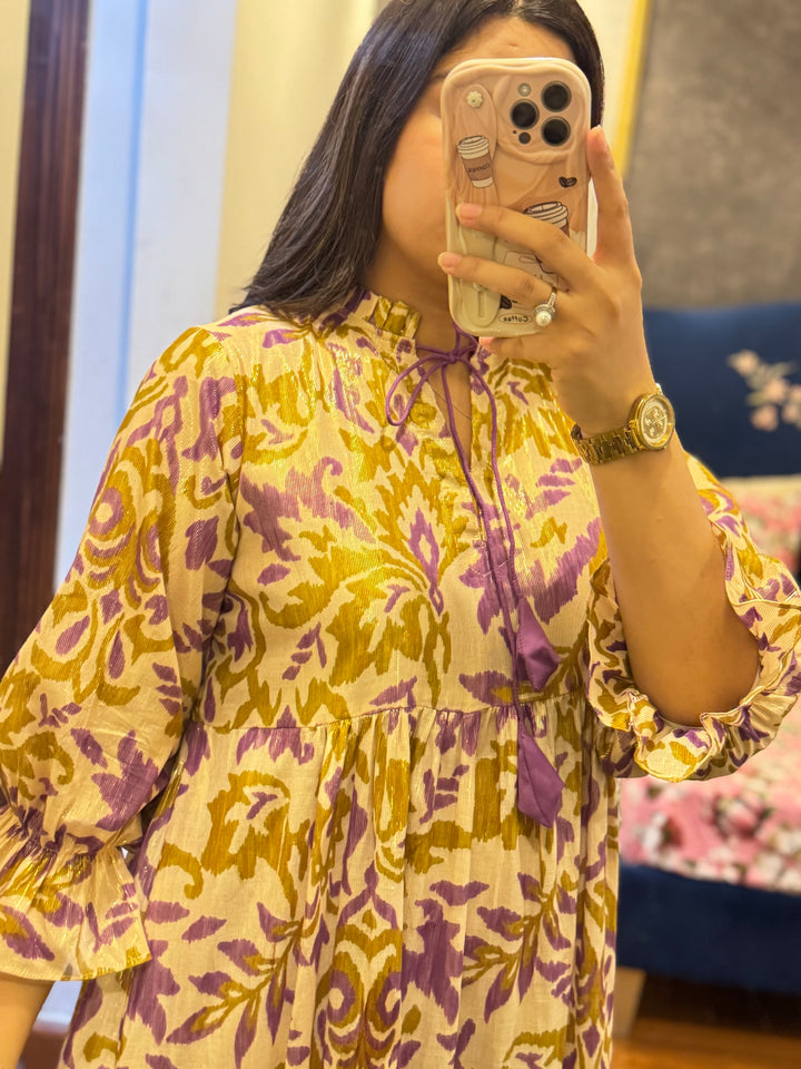 A beautiful purple gold print dress with a three tier flared, frilled sherwani collar with purple dori.