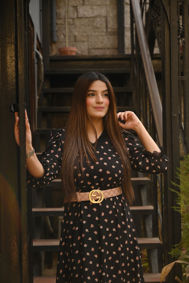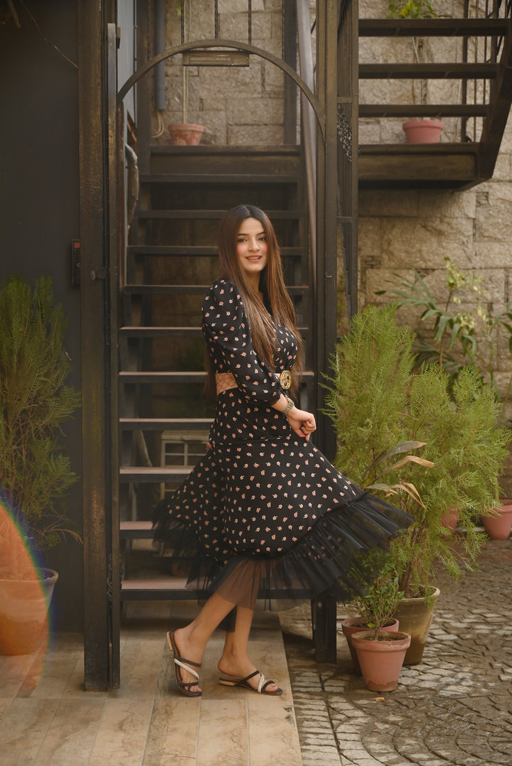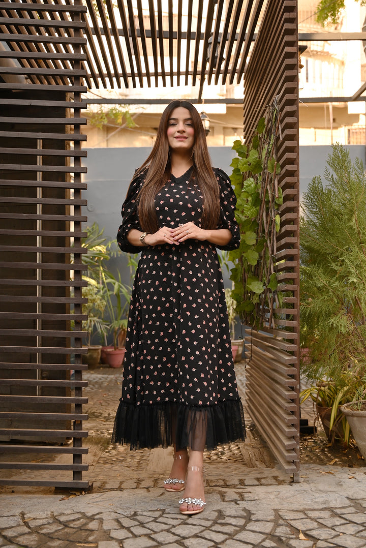 A beautiful floral dress with net frills above the hem. Delicate pleated net joint on the neck and puffy sleeves. Color: Black with pink flowers. Fabric: Georgette