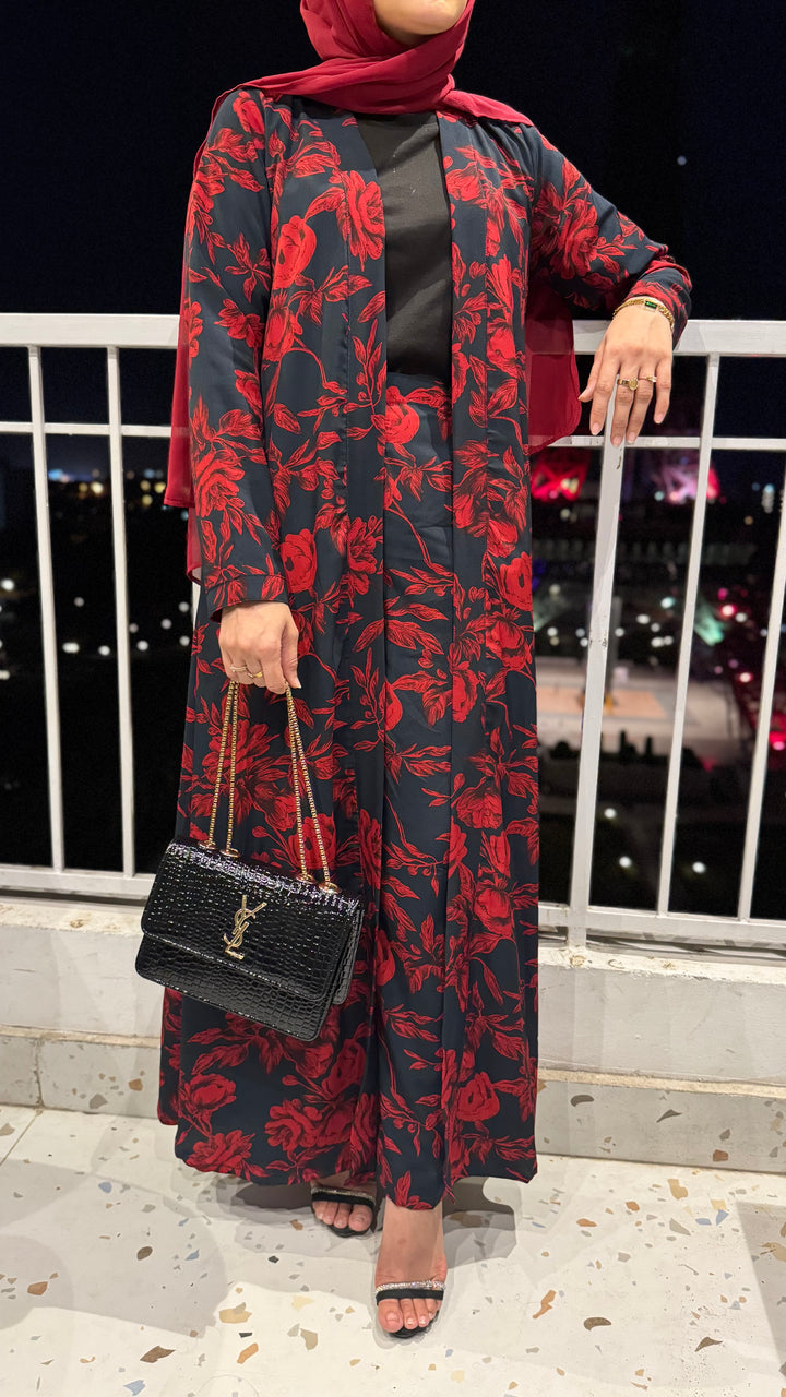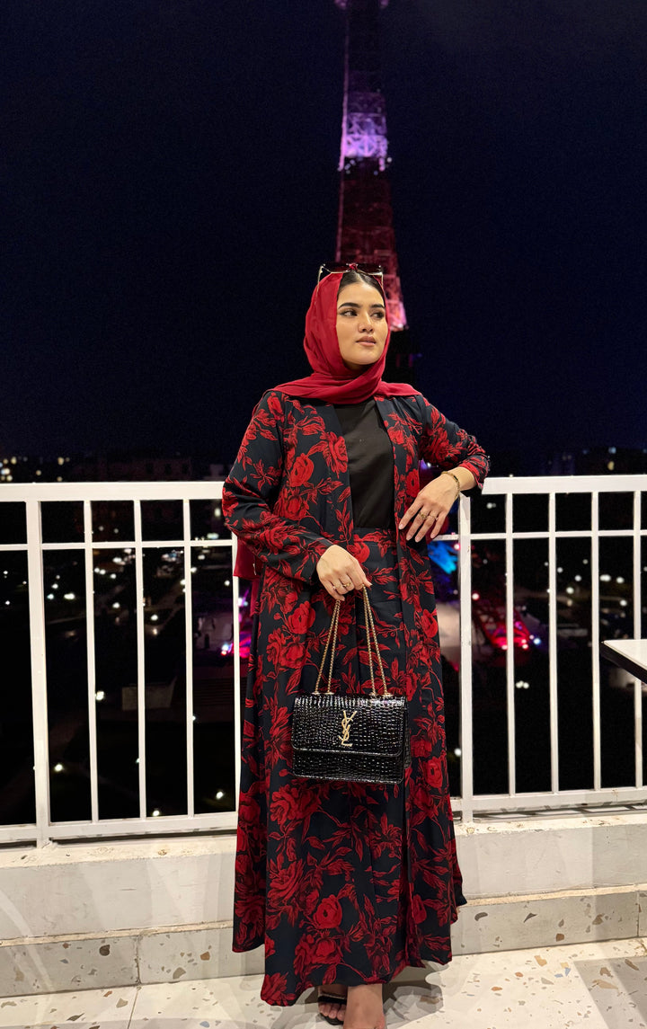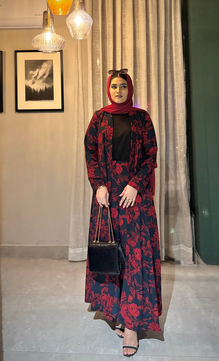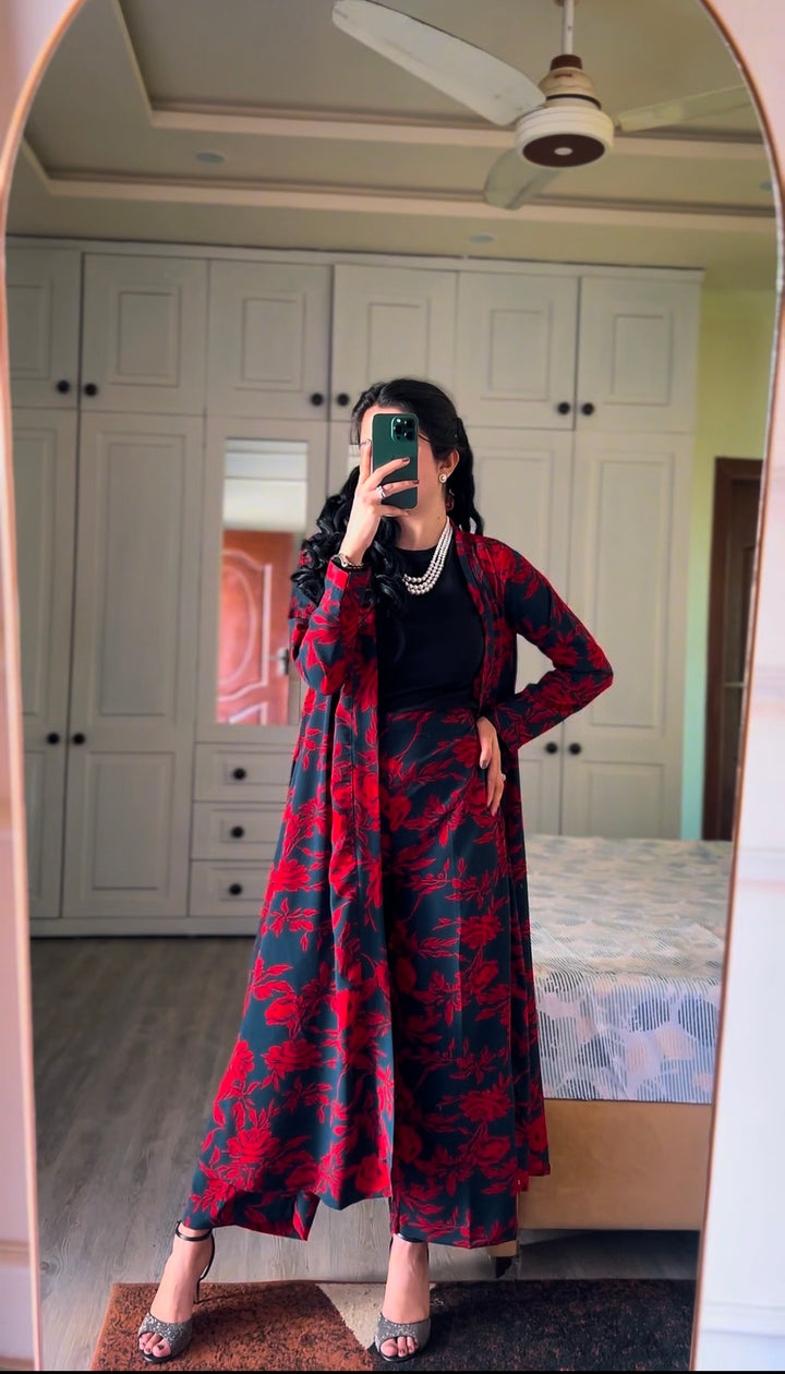 Elevate your style with our Scarlet Grace Shrug Set, a perfect blend of elegance and charm. Featuring a stunning red floral print, this set exudes effortless grace and sophistication. The lightweight shrug drapes beautifully, adding a touch of flair to any outfit, while the matching ensemble completes the look with a chic, coordinated vibe. Whether you’re heading to brunch, a casual day out, or an evening gathering, this set ensures you stand out in style. Its a two piece set. Inner is not included. Fabric: Georgette Shrug Length: Small -Medium 48", Medium-Large 50"-52"Pant Length: 37"-38"-39"
