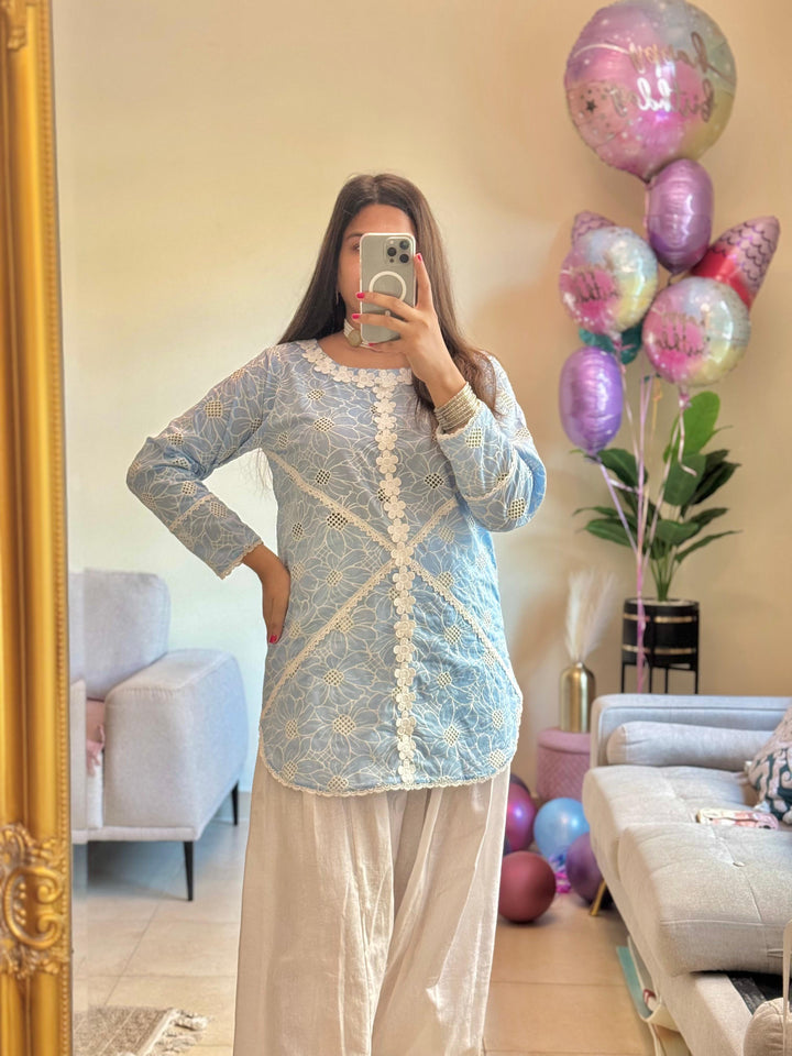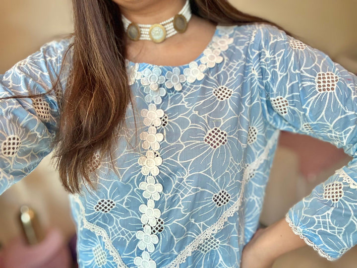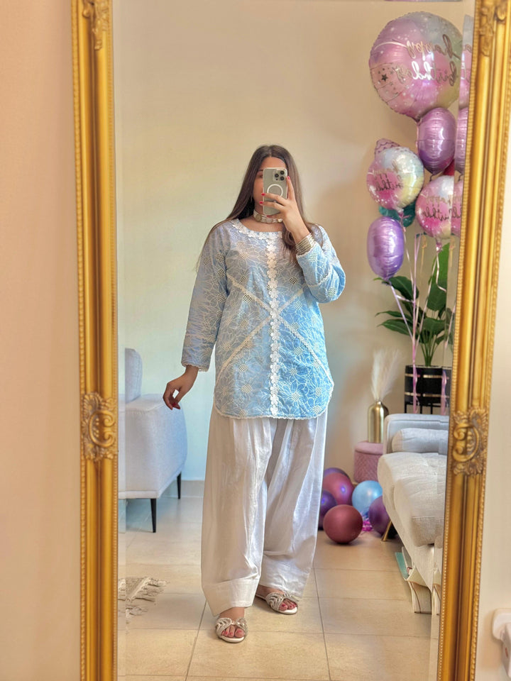 A beautifully crafted chickenkari kamiz with laces and stitched with perfect finishing.