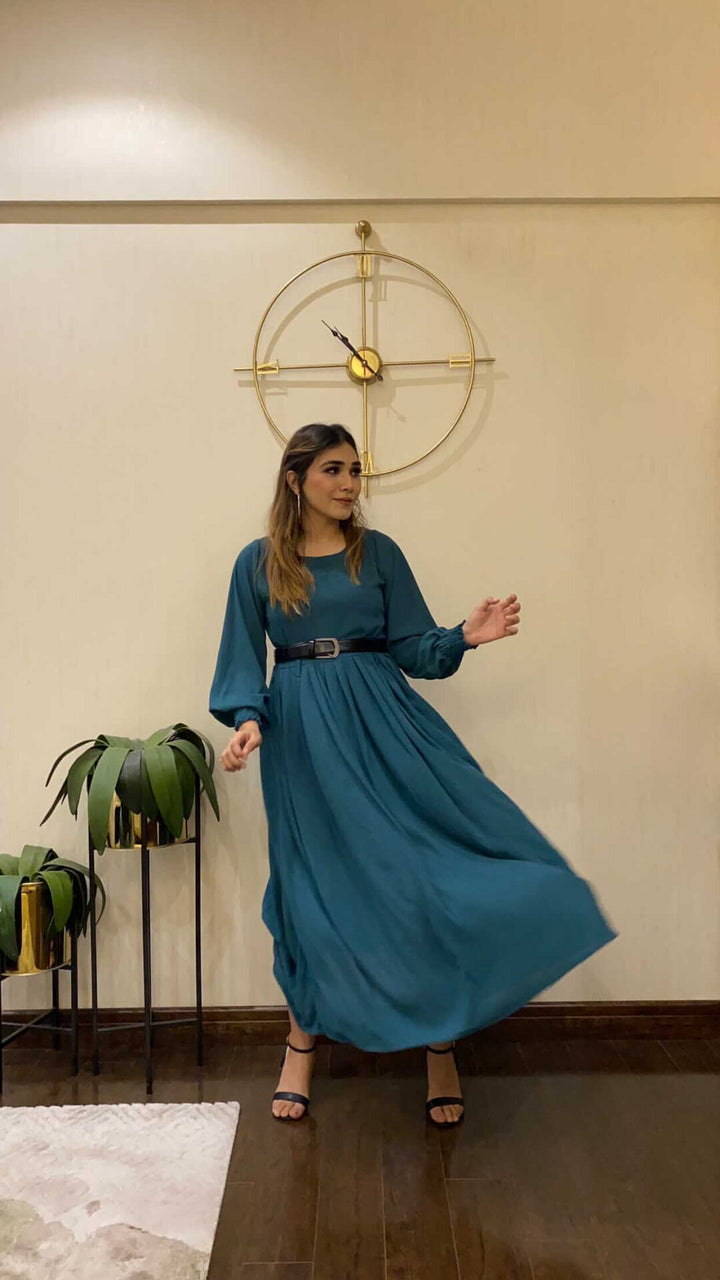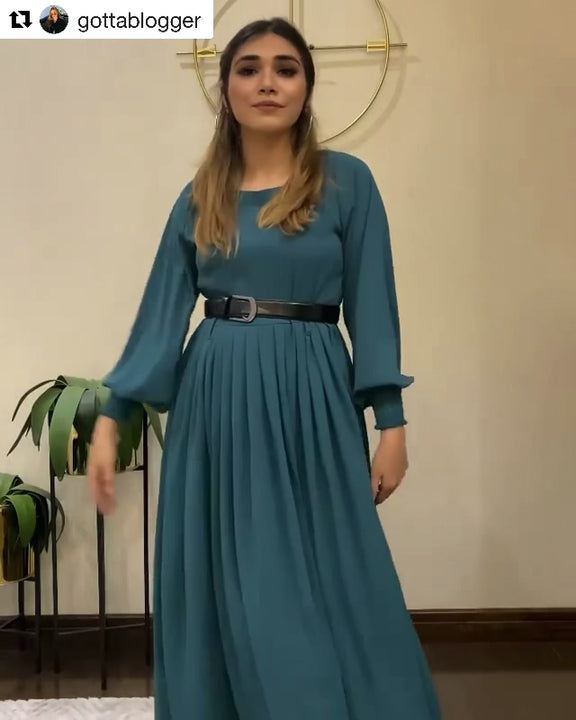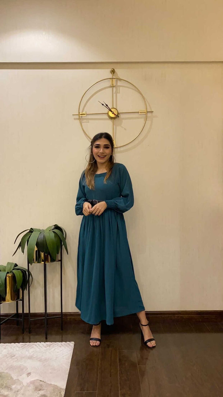Boat Neck, Smoked Sleeves, and Pleated Waist Flared Dress Along with Fabric Belt.