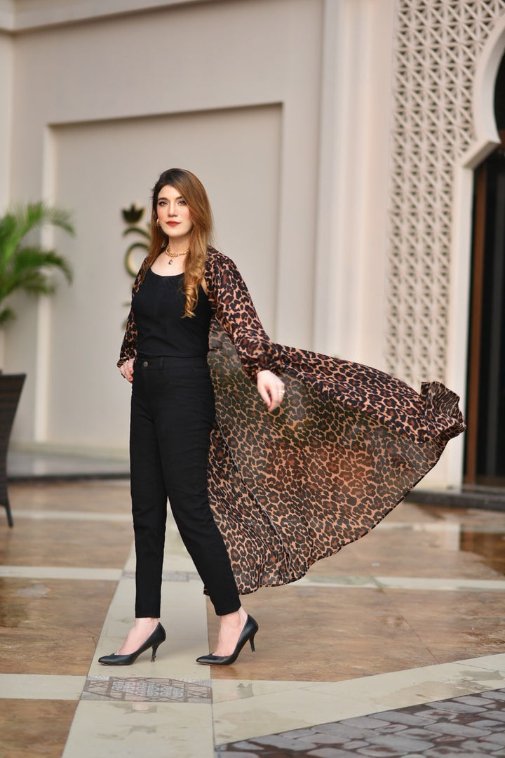 Printed leopard chiffon long shrug with elastic sleeves. Fabric: Chiffon