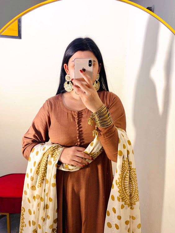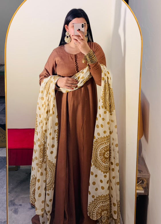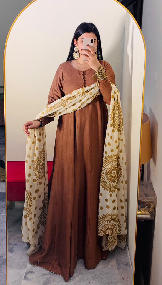 A blend of tradition and grace – this brown kalidaar with loop button details and shimmering gota dori, paired with a golden chamkeeli chiffon dupatta, is the perfect choice for a memorable Eid celebration. P.S : It includes kalidaar and dupatta. Fabric Dress: Irish Raw Silk (Flowy)Dupatta: Chiffon