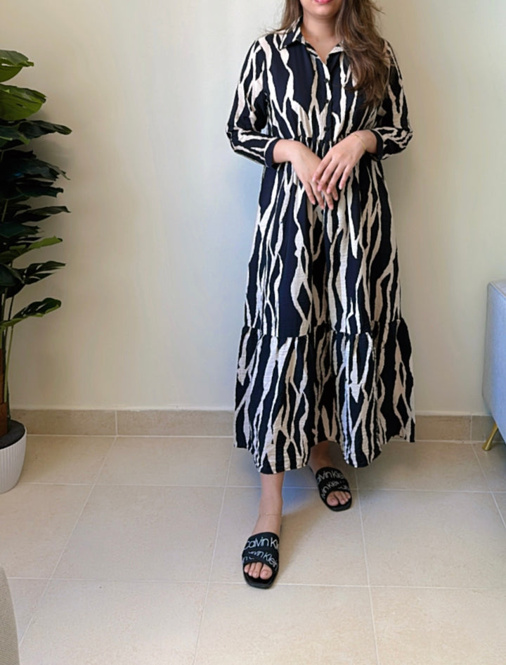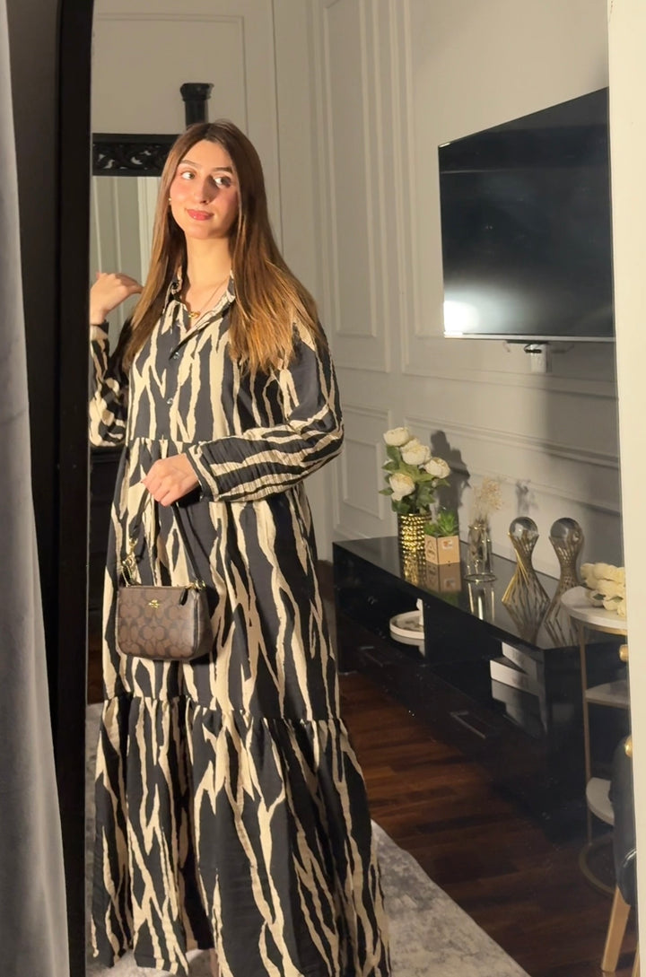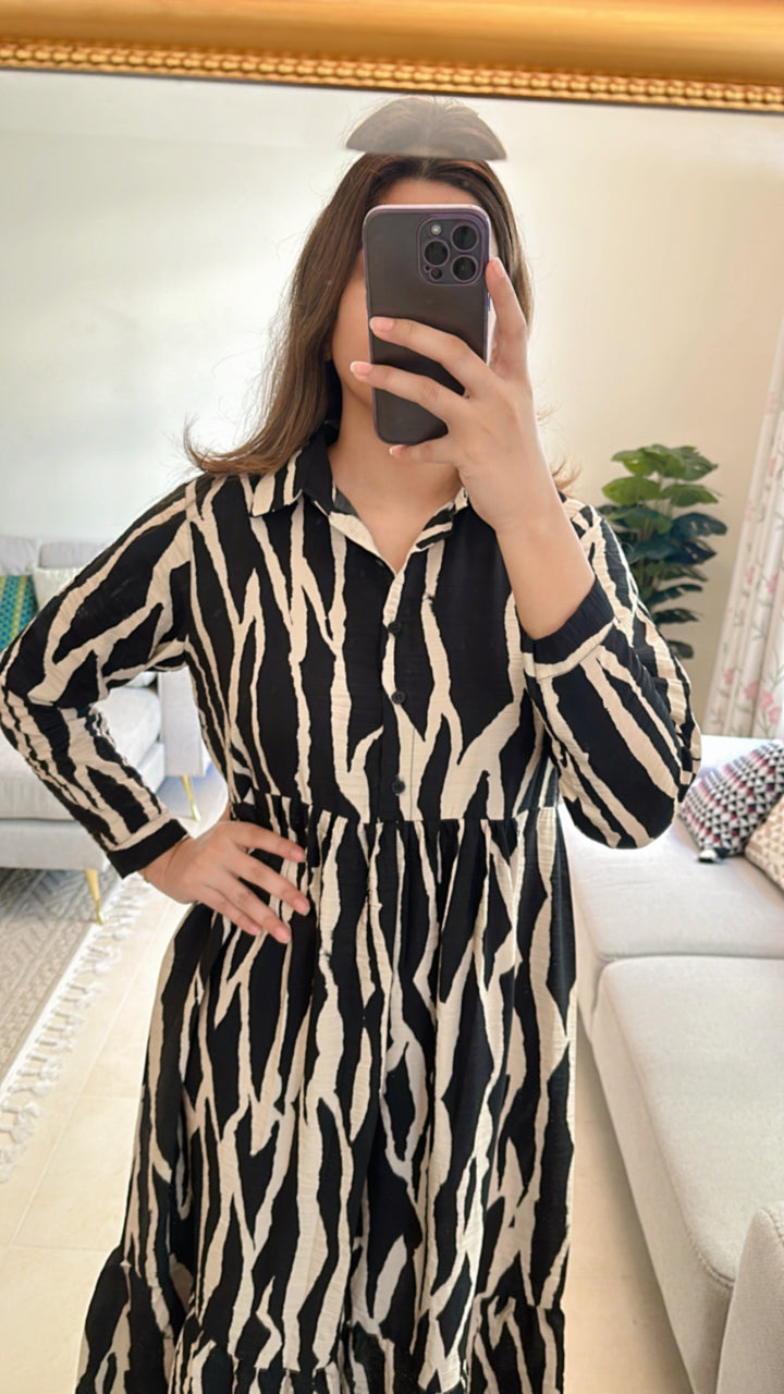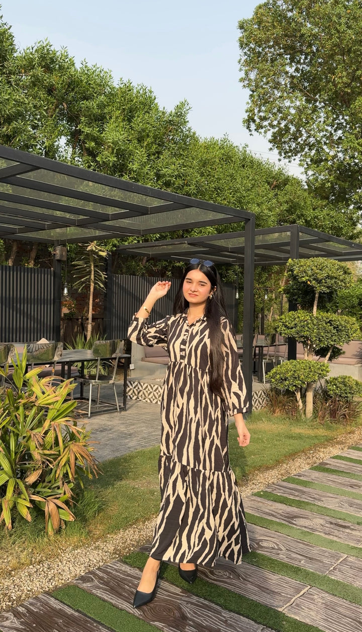 This Zebra Print Dress features a button down bodice and full straight sleeves for a modern look that's comfortable and sophisticated. Crafted from crinkle crepe fabric, this two-tier dress is perfect for any occasion.